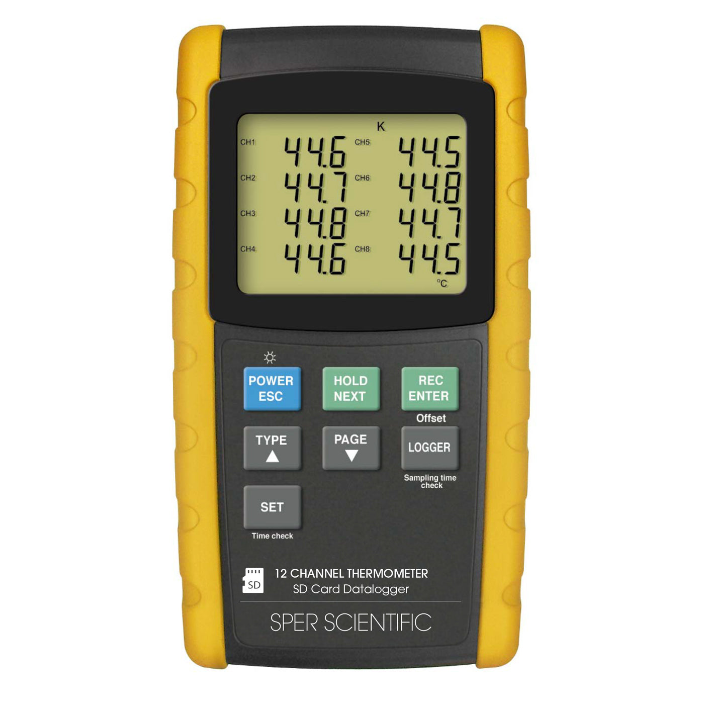 The user programmable sampling rate is adjustable from 1 to 3600 seconds with Min/Max, Data Hold, and Auto Power Off. Data can be recorded from all 12 channels simultaneously onto an SD card for later analysis.