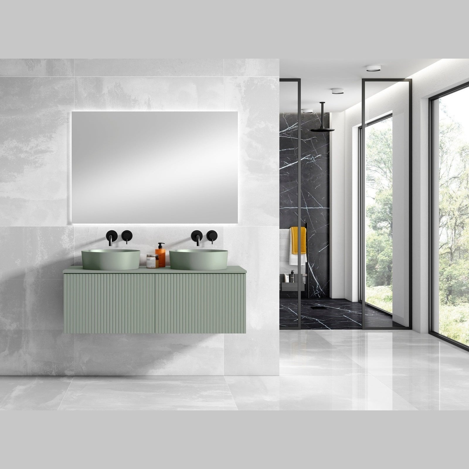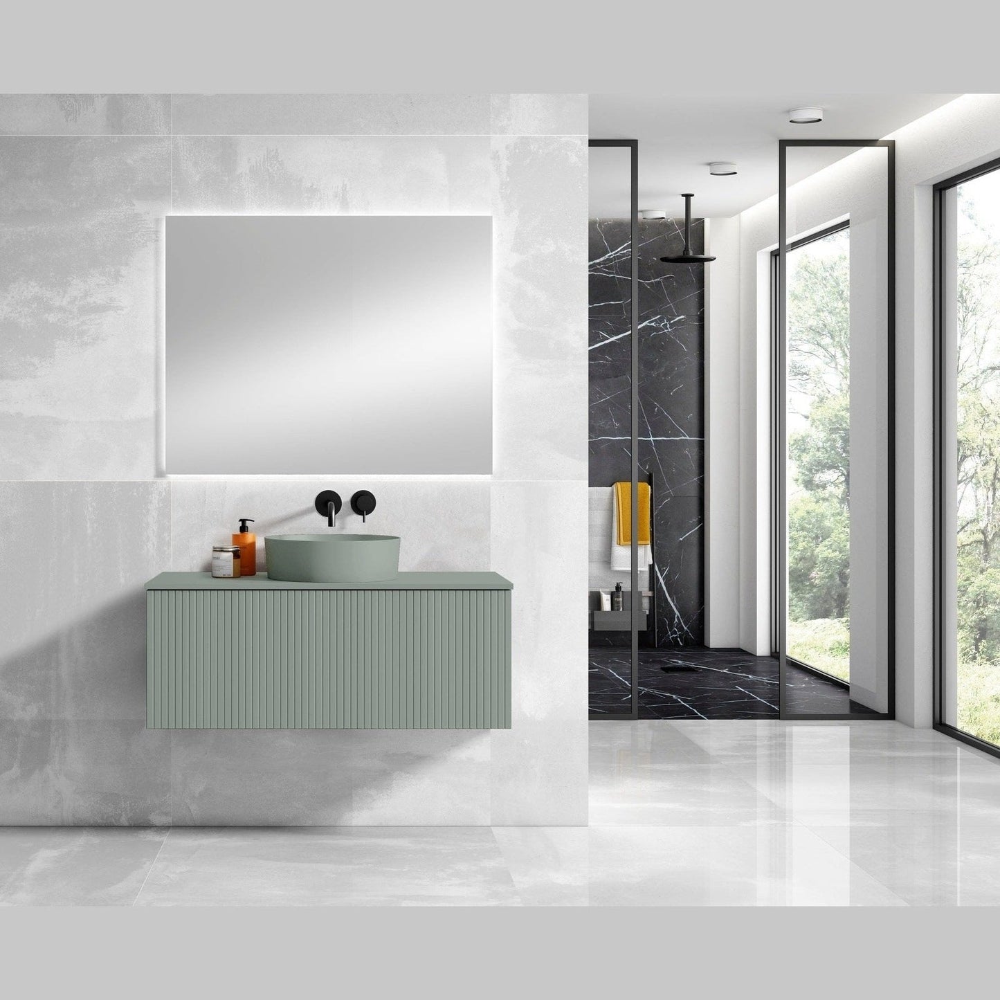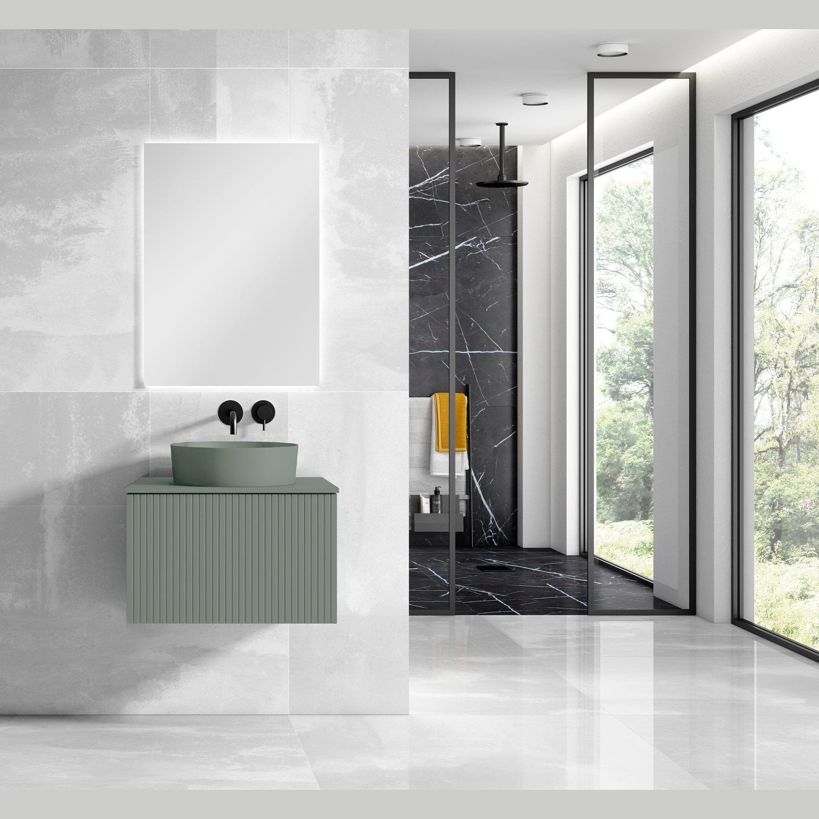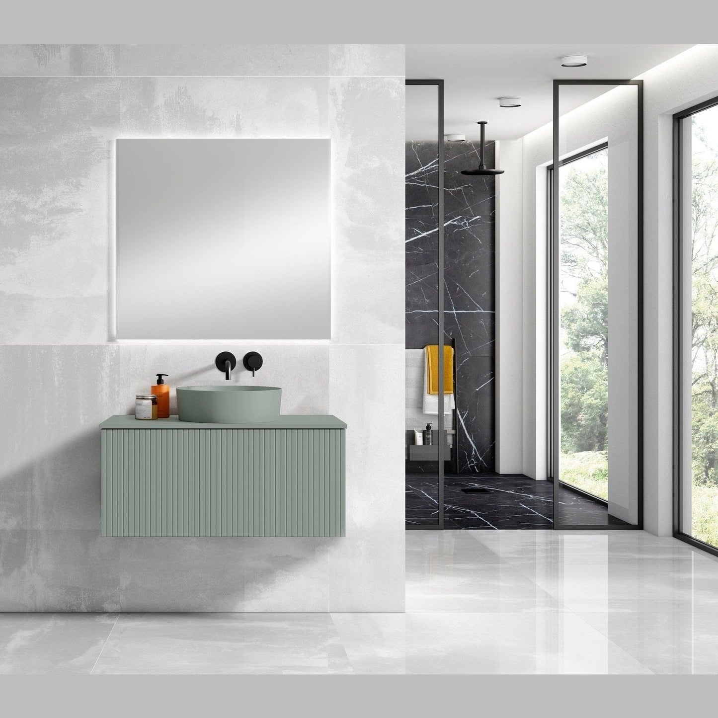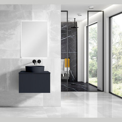 A: A modern, wall-mounted floating vanity featuring a matching top and integrated ceramic vessel sink, available in White, Grey, Green, or Navy finishes for a stylish, contemporary look.