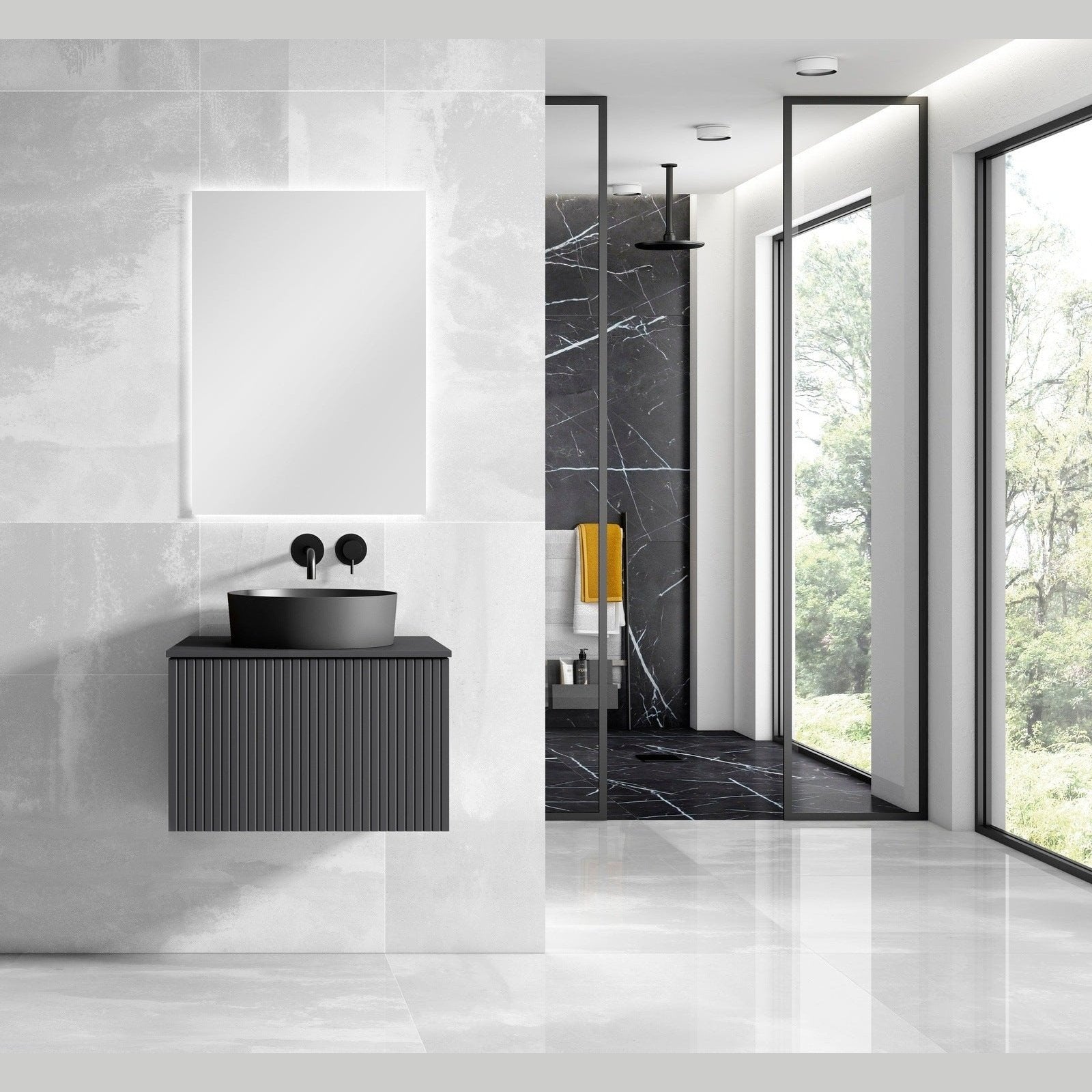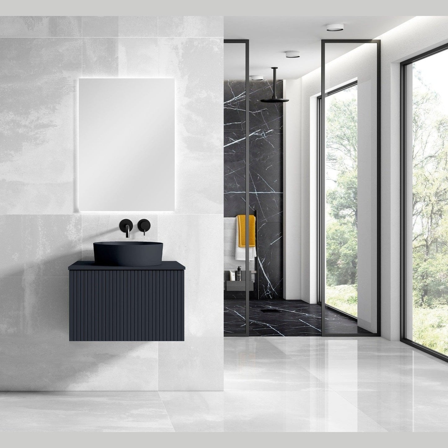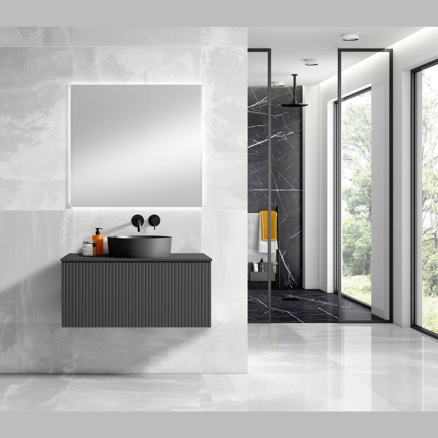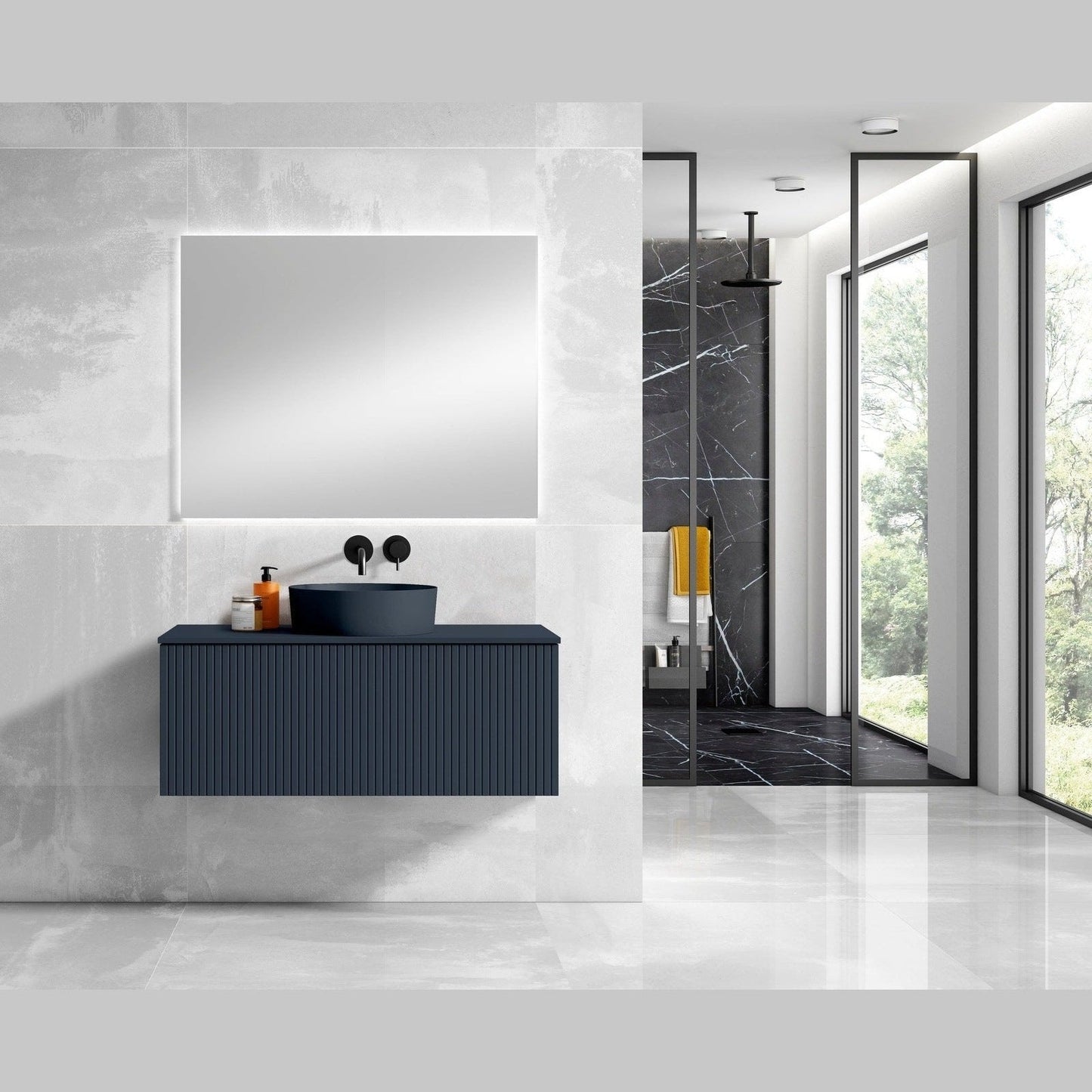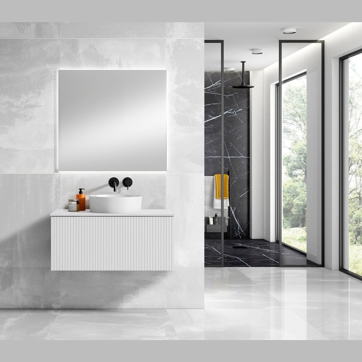 A: Durable MDF construction, soft-close doors, spacious storage, and a sleek vessel sink that adds an elegant touch to your bathroom.