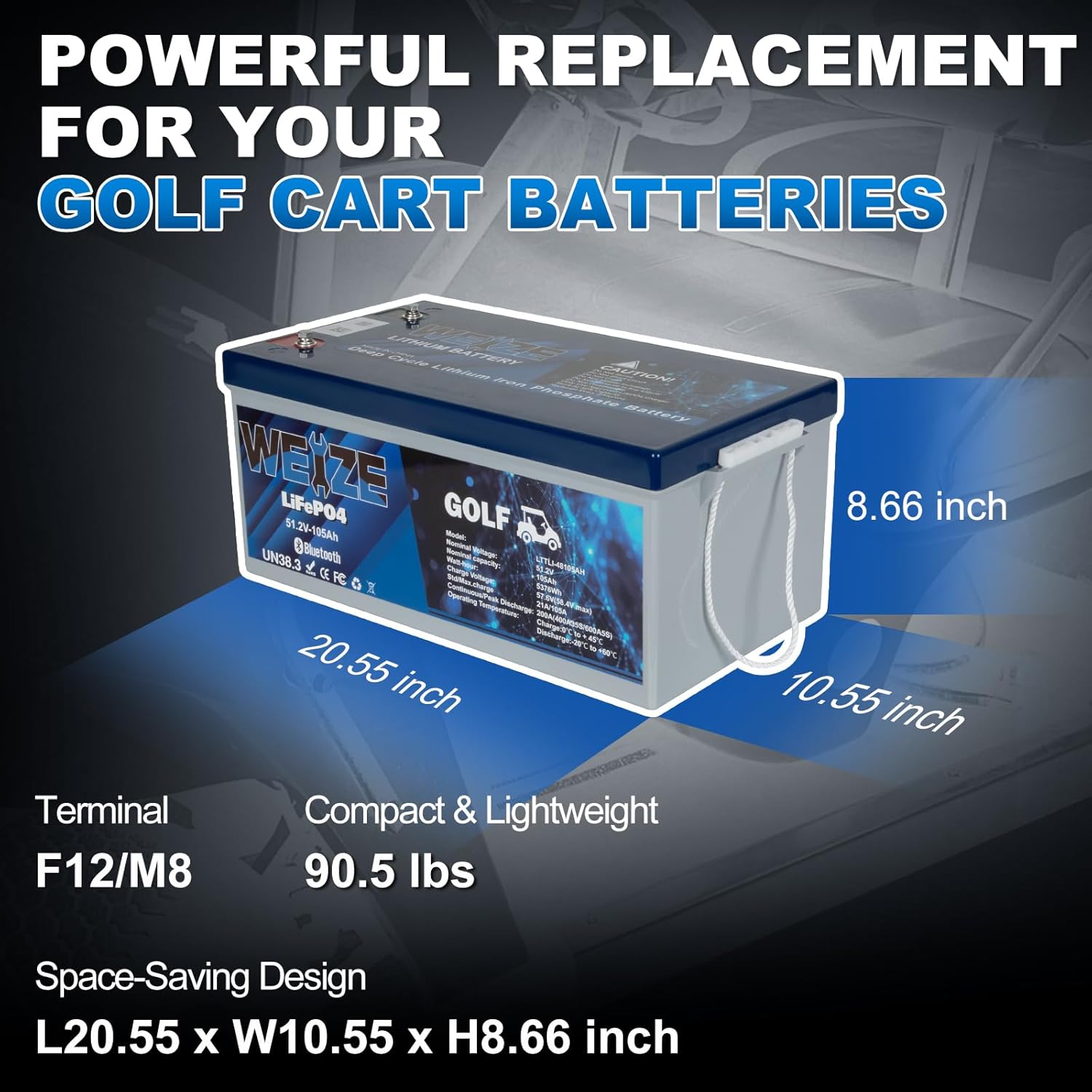 High Power Capacity: The WEIZE 48V 105Ah LiFePO4 battery provides 5040Wh, offering dependable, long-lasting power for golf carts, trolling motors, solar systems, and off-grid applications.