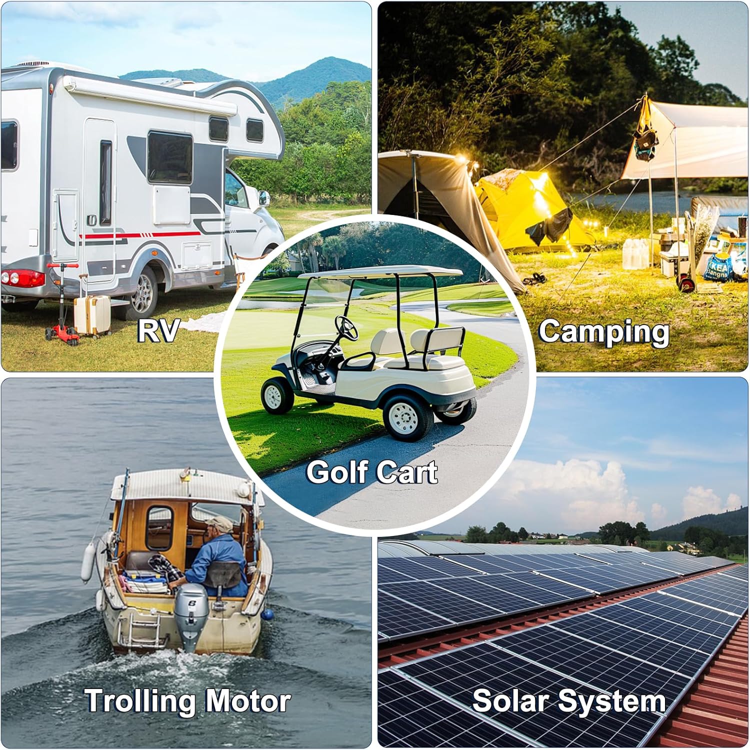 - Ideal for various applications, including golf carts, trolling motors, boating electronics, camping, fish finders, and solar systems.