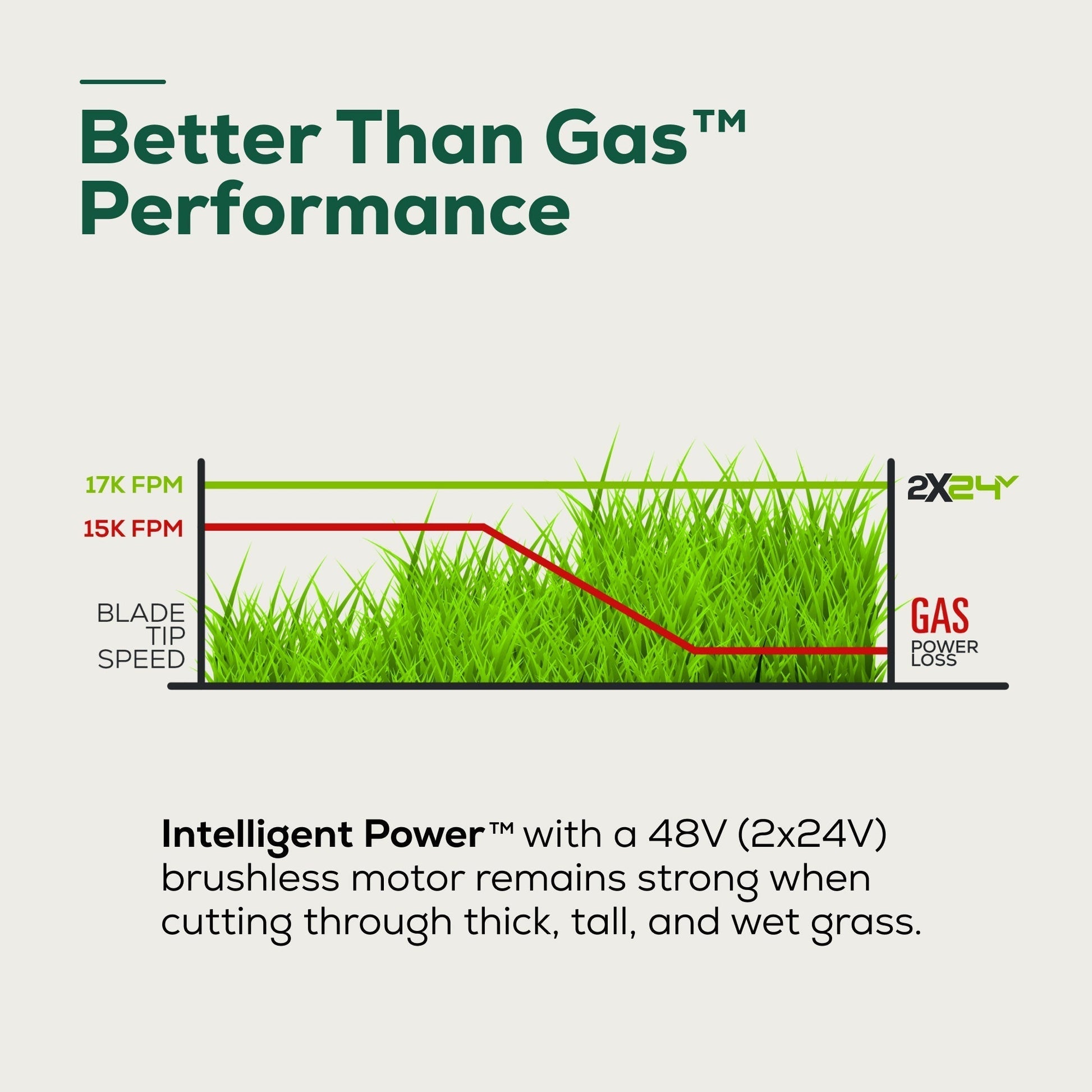 The Greenworks 2x24V 21” Self-Propelled Mower features the most advanced power-cutting system in the industry. Where gas mowers bog down, our intelligent mower senses grass conditions to send optimal power to the 48V brushless motor, maintaining consistent blade speeds of 3,250 RPM through tall, thick, and wet grass.