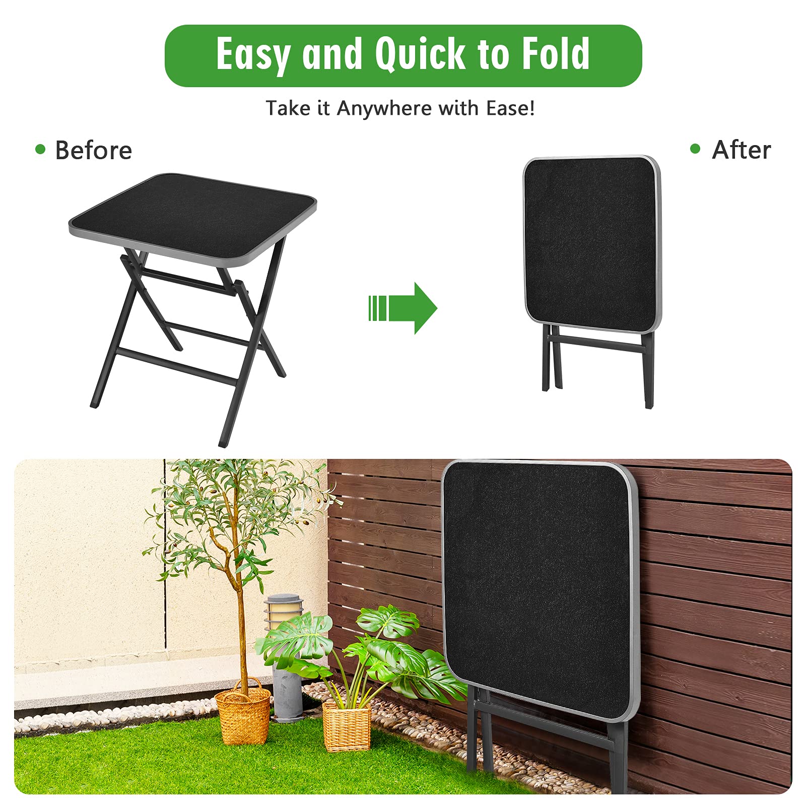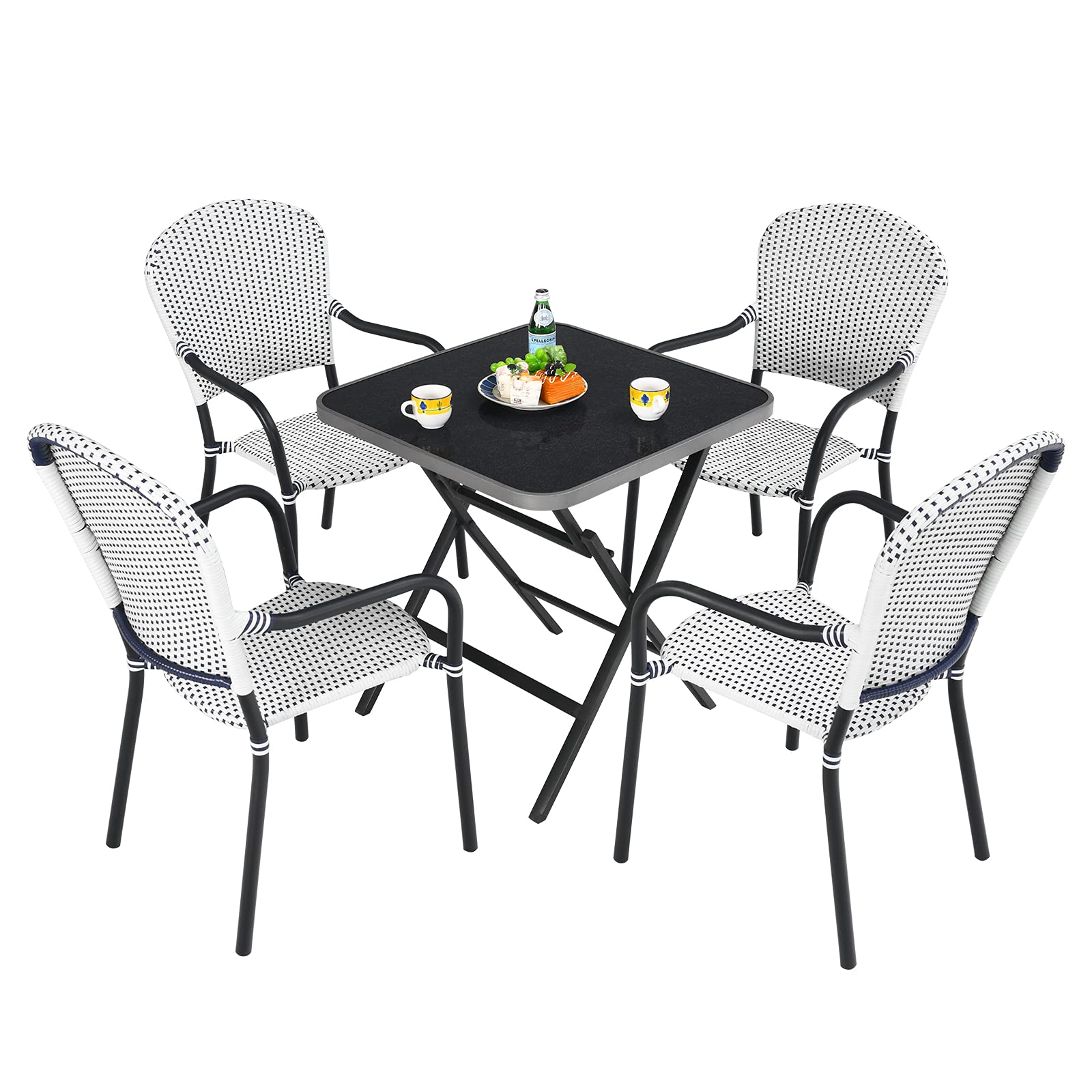 Our modern 5-piece patio dining set will become a perfect addition to your home! Coming with 1 square table and 4 rattan chairs, this 5pcs patio dining bistro set can perfectly accommodate you and your family members to have a relaxing dining or conversation time. Made of powder-coated steel and aluminum frame plus all-weather rattan material, this dining table and chairs set are stable and durable enough to support long-lasting indoor or outdoor use. The table is equipped with a high-quality tempered glass top for storage. With the ergonomic backrest and armrests, you won't feel tired even after long-time sitting. What's more, the foldable table and stackable chairs help to save a lot of living space while offering easy storage and transportation. Enjoy your leisure time with your family or friends!