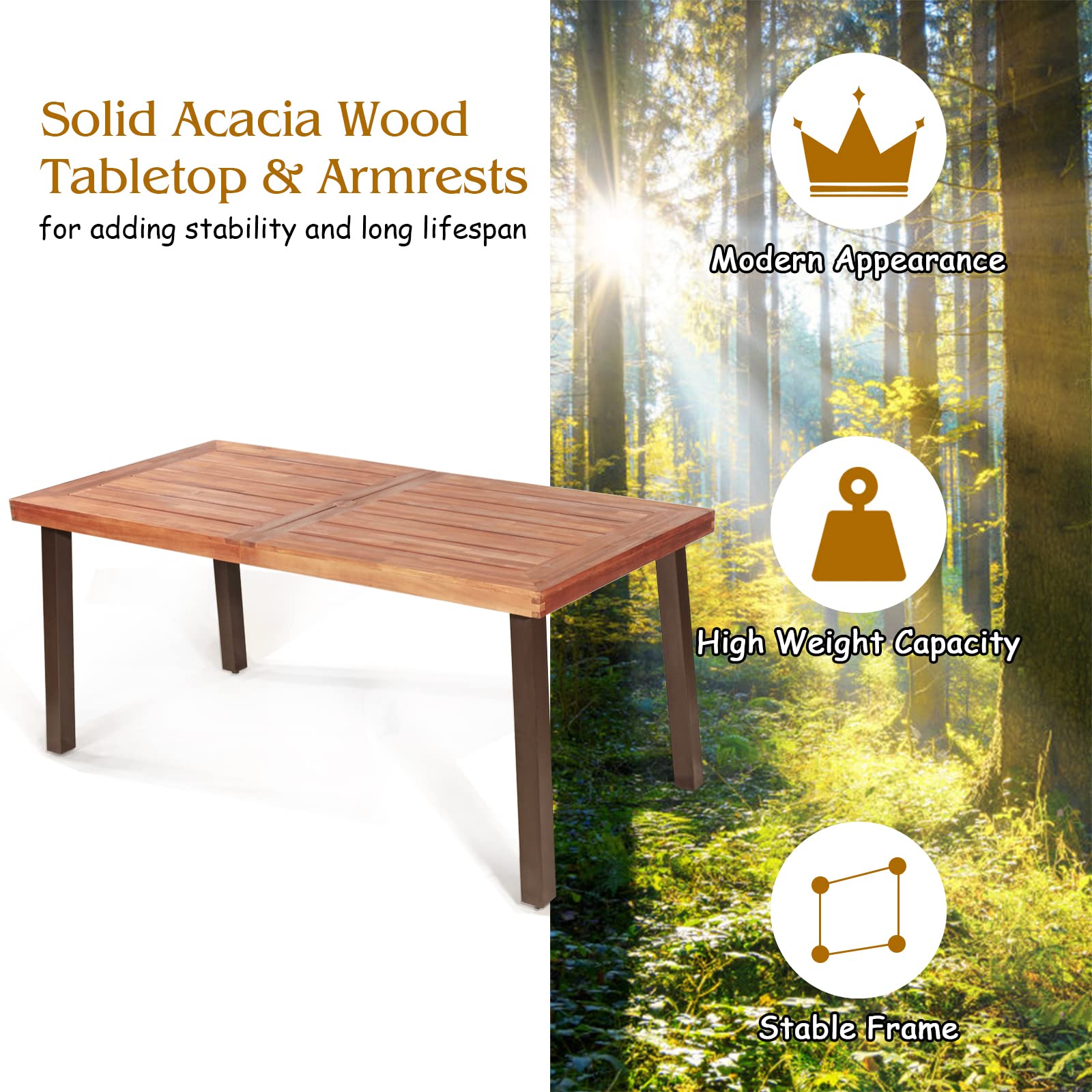 This 5-piece outdoor patio furniture set is coming with 2 armchairs, 2 benches, and 1 rectangular table. Large acacia wood tabletop provides enough space to place food or other items. And the middle 2" umbrella hole fits most umbrellas which can bring you cool shade in hot weather. Ergonomic chairs and benches with high backrests, spacious seats, and wide solid wood armrests can bring you a firm and cozy sitting experience. As for quality, made of powder-coated steel frame and all-weather PE rattan, this patio dining set ensures excellent stability and long service life. Combining natural acacia wood grain and stylish rattan style, this dining set can add charm to your outdoor area, including the garden, backyard, poolside, patio, and more.