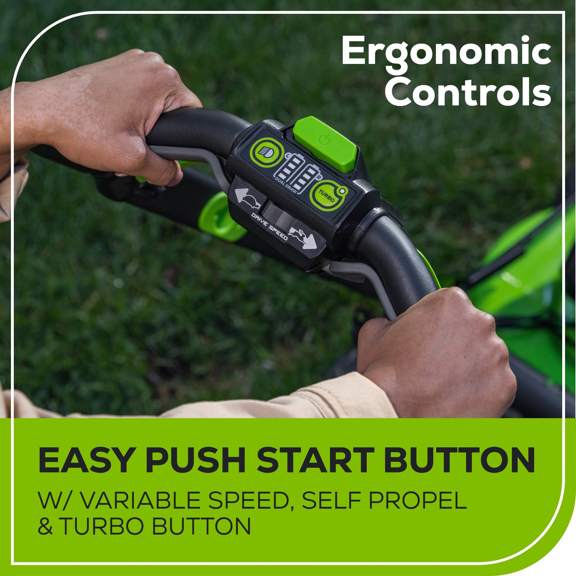 Powerfully smart.Tackle the toughest yards, one-handed, because our smart mowers never bog down. When grass gets thick, tall, or wet, Greenworks sensors tell our brushless motor to rush power to the mower blades. The end result? The perfect lawn, every time.