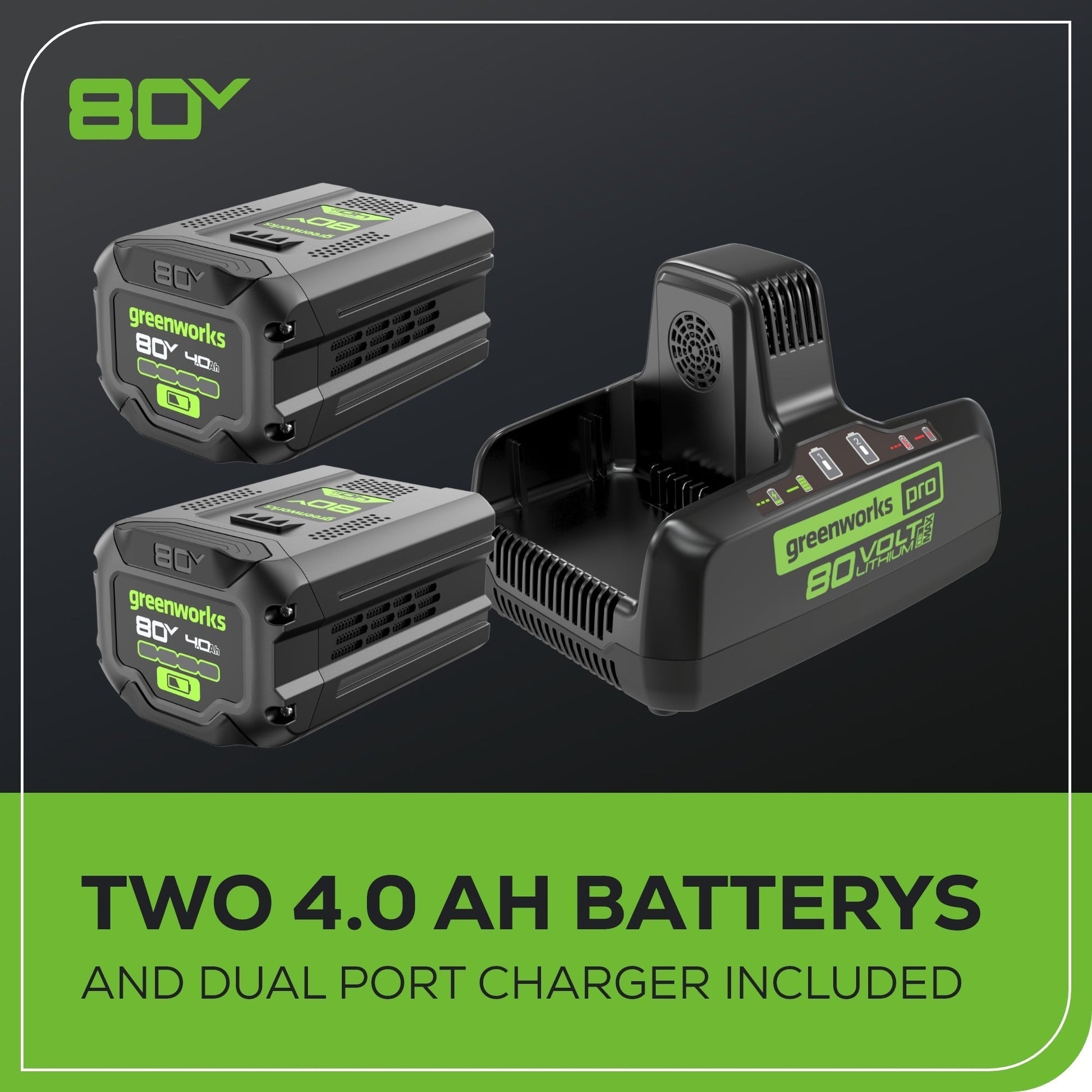 A: The 80V battery offers strong performance with the convenience of cordless operation. With a 3000 PSI rating and 2.0 GPM flow, it provides effective cleaning power, and the dual-port charger allows for simultaneous charging of both batteries.