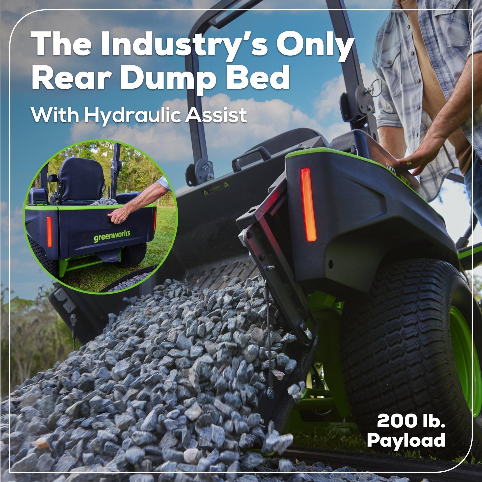 Additional features include high torque rear-wheel drive that can tackle hills up to a 15° incline, front and rear-mount attachment capability to maximize towing power and functionality, built-in Greenworks Greenshield theft protection, and more.