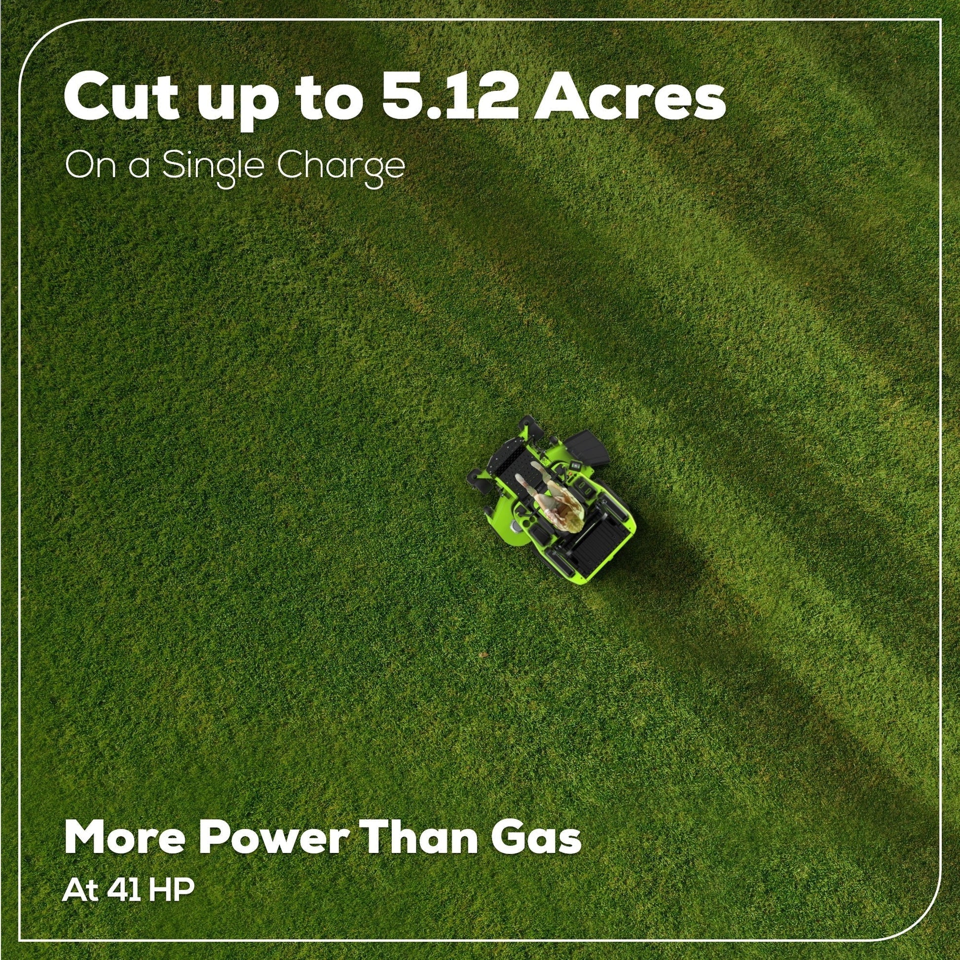 Greenworks electric riding mowers are here to level up your mow time. With 41hp equivalent brushless motor technology, the Greenworks CrossoverZ mows up to 5.12 acres on a single charge-that‘s the industry’s longest cut time. While you sit comfortably in the high-back padded seat with back-support and foldable arm rests, our intelligent microchips constantly monitor grass conditions to provide the perfect amount of power output needed to get the job done. This means no wasted energy and no more bogging down in even in the tallest, thickest, and wettest grass. Simply put, Greenworks electric riding mowers make light work of yard work.
