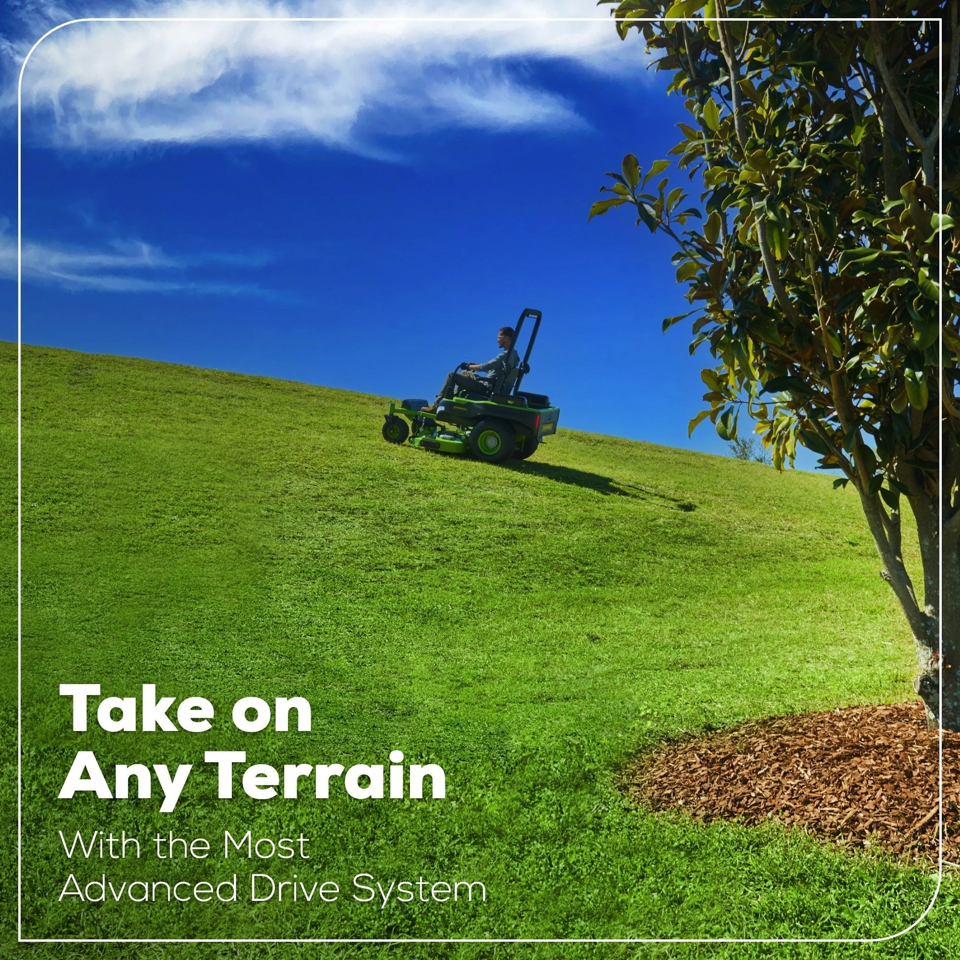 A: This mower features a zero-turn radius, allowing for superior maneuverability and a professional-quality finish. With a wide 60-inch cutting deck and long-lasting battery power, it delivers both speed and efficiency for large lawns. The combination of multiple battery sizes ensures extended runtime for large jobs.