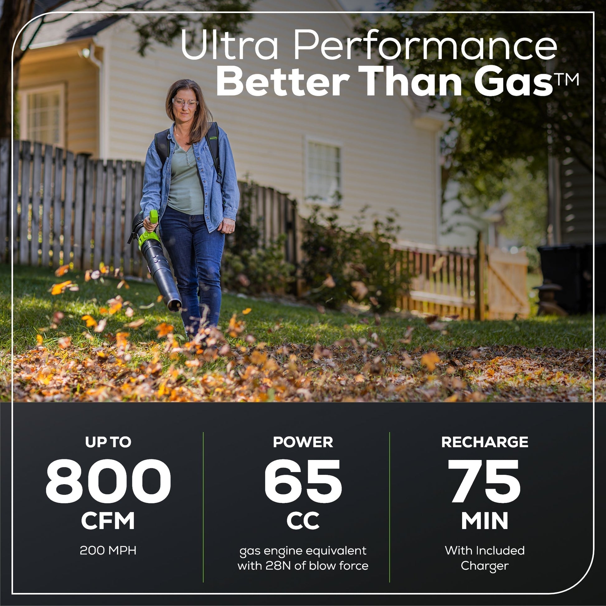 Unmatched Power: With 800 CFM, the Greenworks 80V Backpack Blower offers exceptional airflow to clear debris quickly and efficiently, perfect for large yards and commercial use.