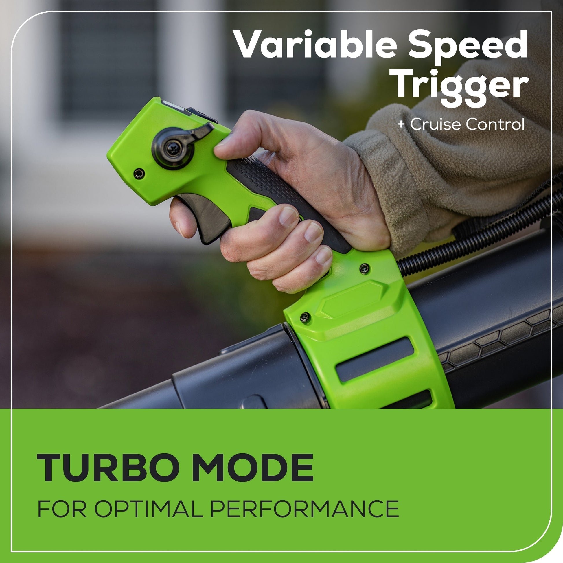 A: This blower combines powerful performance with comfort and convenience, offering the ideal solution for efficiently tackling yard work without the noise, emissions, or maintenance of gas-powered models.