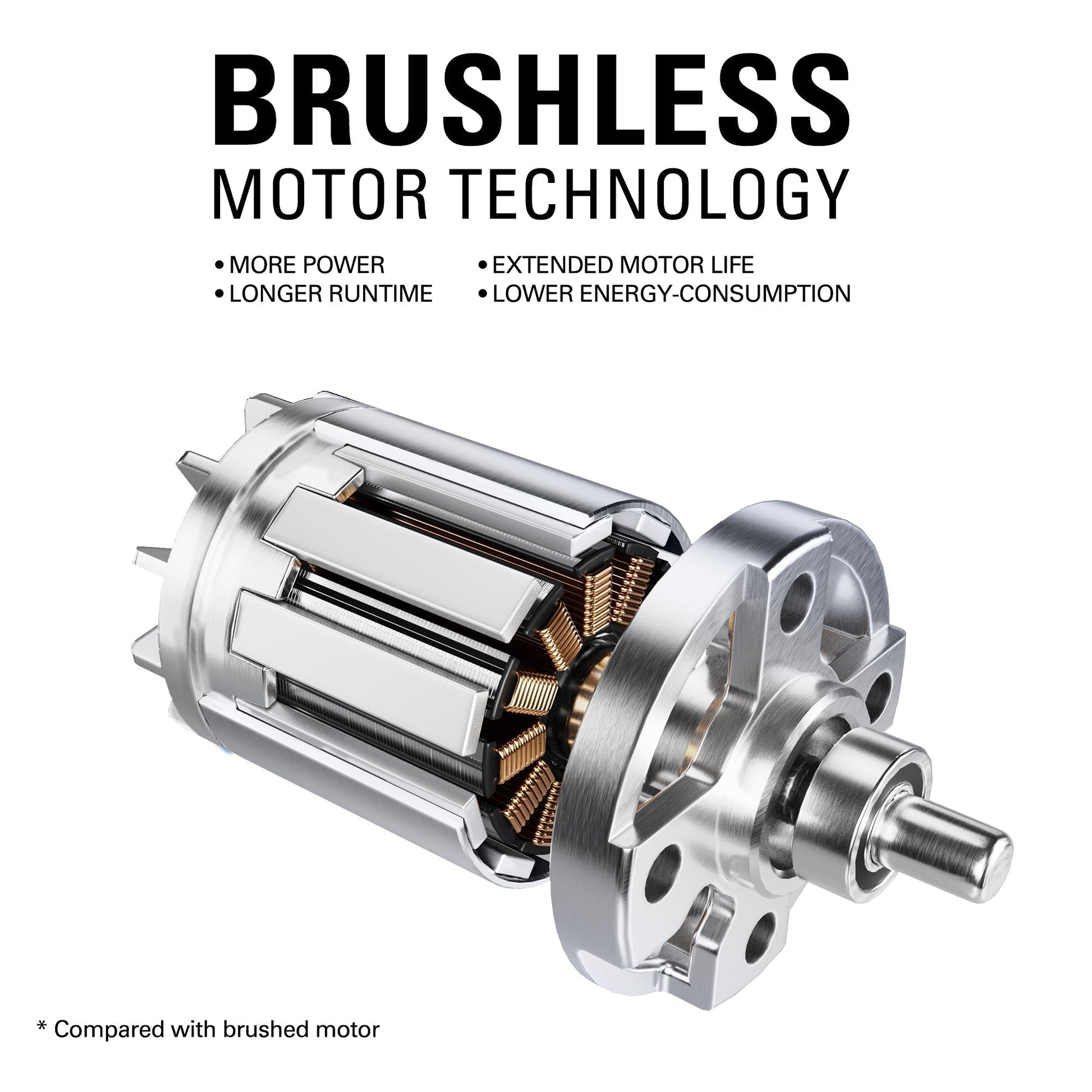 - Intelligent Brushless Motor Technology - 2x more torque, more power, longer runtimes, quiet operation, and extended motor life