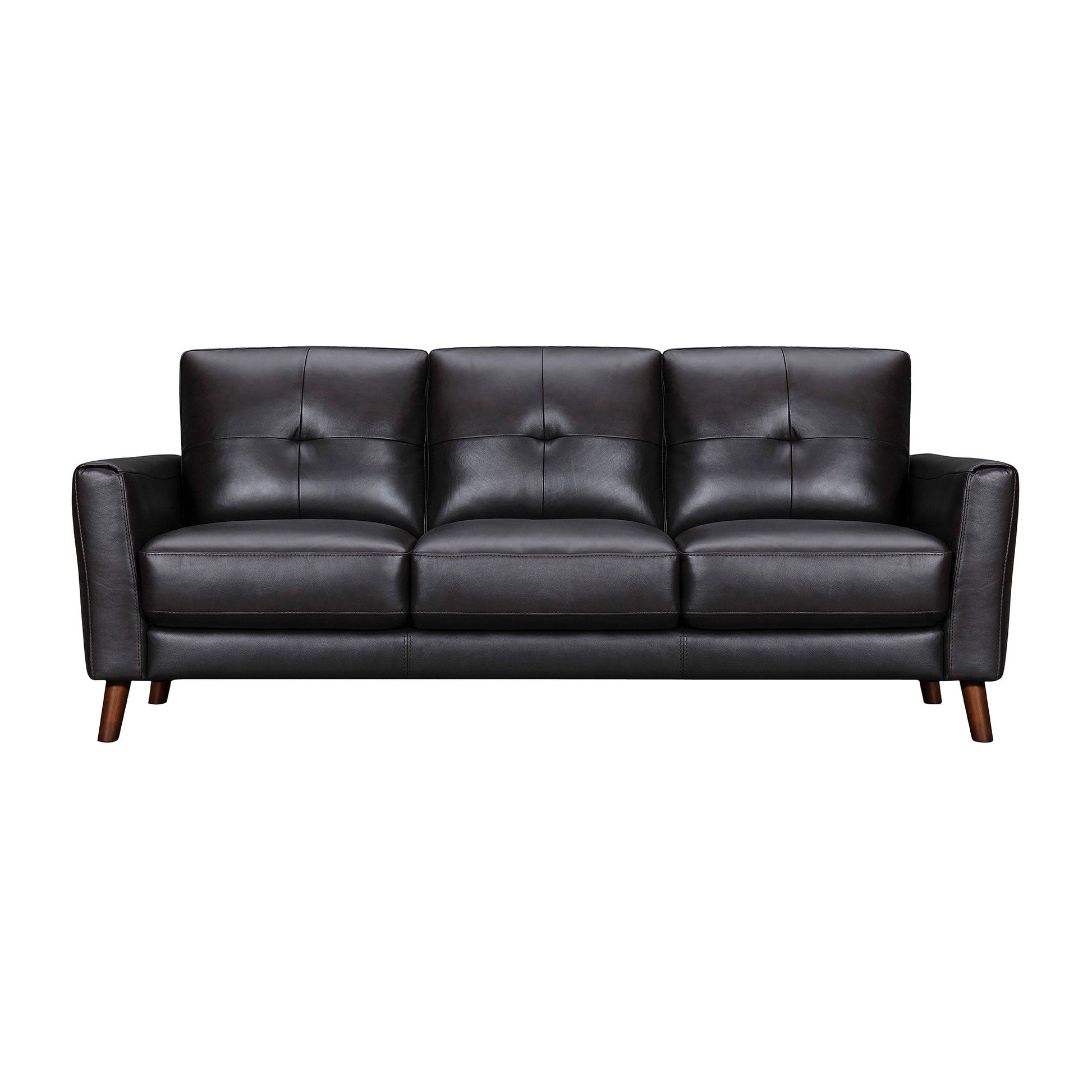 An interior designer's dream, this buttery soft high grade leather 82-inch black leather sofa with brown legs will bring just the right touch to your space. The premium leather used makes your lounging luxuriously comfortable and adds an elegant appeal to your space. Solid colors give you lots of decorative options and are easy to work into your decor scheme. Web suspension construction gives this piece strong support and makes it comfortable to sit even for long periods of time. Square arms offer a comfy place to rest. The tufted stitching pattern adds visual interest and fine designer detailing. A great showpiece for your room, this sofa is a must have. 35-inch H x 82-inch W x 37-inch D