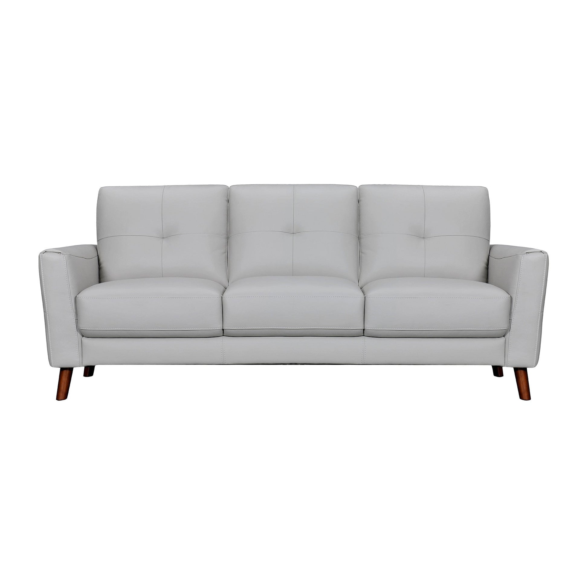 A: Its sleek light slate gray genuine leather, elegant brown legs, and clean contemporary lines offer a refined mix of luxury, comfort, and modern appeal for any living room.