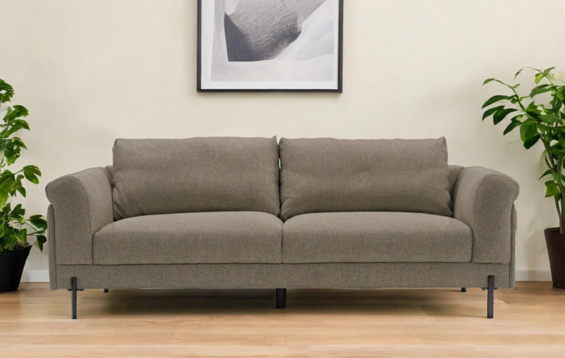 Designed for comfort and good looks, this 84-inch beige sofa with black legs is a great option to anchor your space. Built to last, this solid color standard is upholstered with 100% polyester that is designed to be soft, resilient, easy to maintain, and stand the test of time. Solid colors give you lots of decorative options and are easy to work into your decor scheme. Sinuous springs construction gives this piece strong support and makes it comfortable to sit even for long periods of time. Removable back cushions make this sofa easy to manage. Flared arm offer a comfy place to rest. Black metal legs effortlessly elevate the room and add a touch of contemporary design. Built to last, this sofa will be a great centerpiece for your room. 33-inch H x 84-inch W x 37-inch D