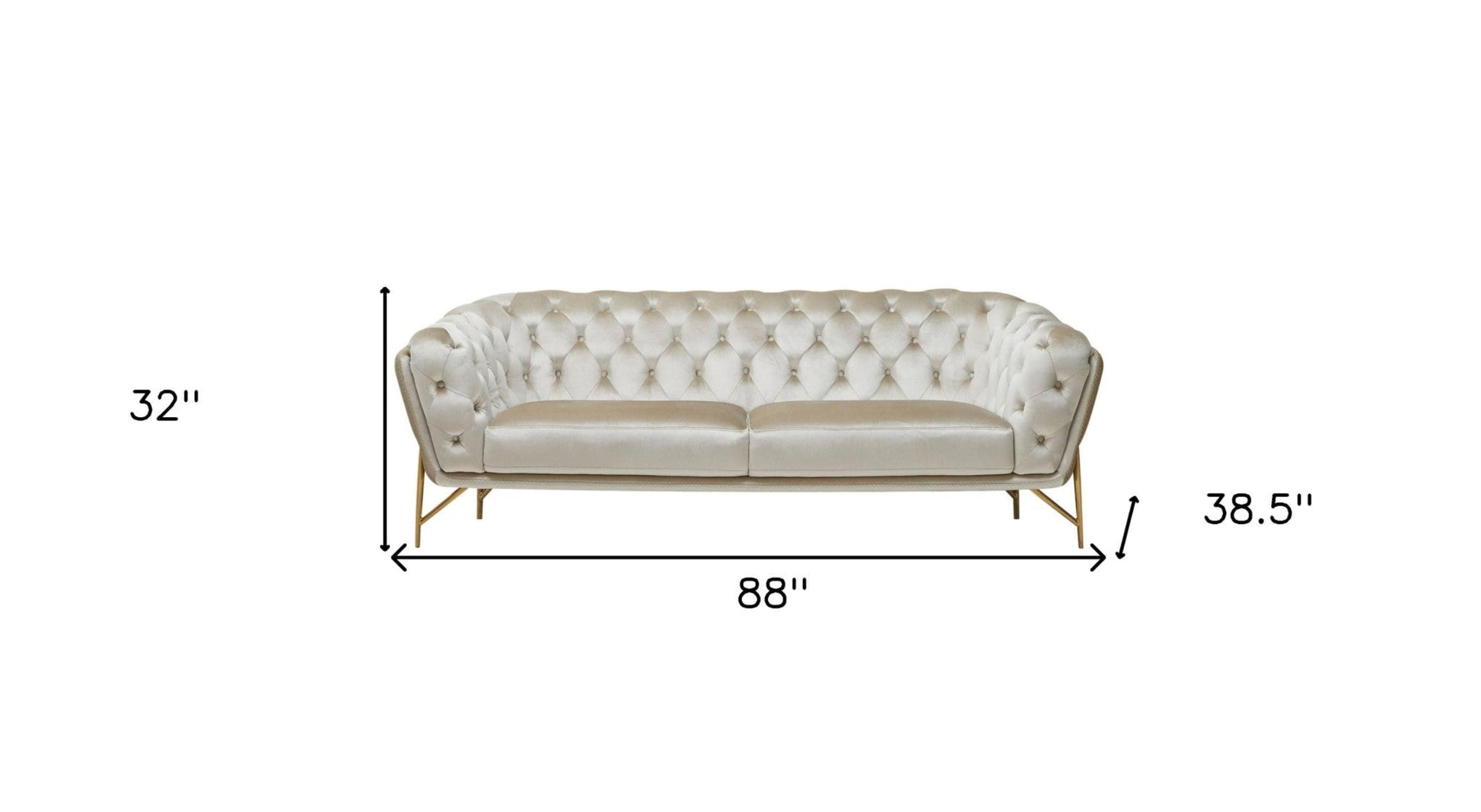Transform your home's interior with this luxurious 88-inch beige velvet sofa with gold legs. This solid color standard is made from sturdy and resilient velvet that has a warm and rich look and is a super soft and comfortable to the touch. Solid colors give you lots of decorative options and are easy to work into your decor scheme. Web suspension construction gives this piece strong support and makes it comfortable to sit even for long periods of time. Square arms offer a comfy place to rest. The tufted stitching pattern adds visual interest and fine designer detailing. Gold stainless steel legs effortlessly elevate the room and add a touch of contemporary design. A great showpiece for your room, this sofa is a must have. 32-inch H x 88-inch W x 38.5-inch D