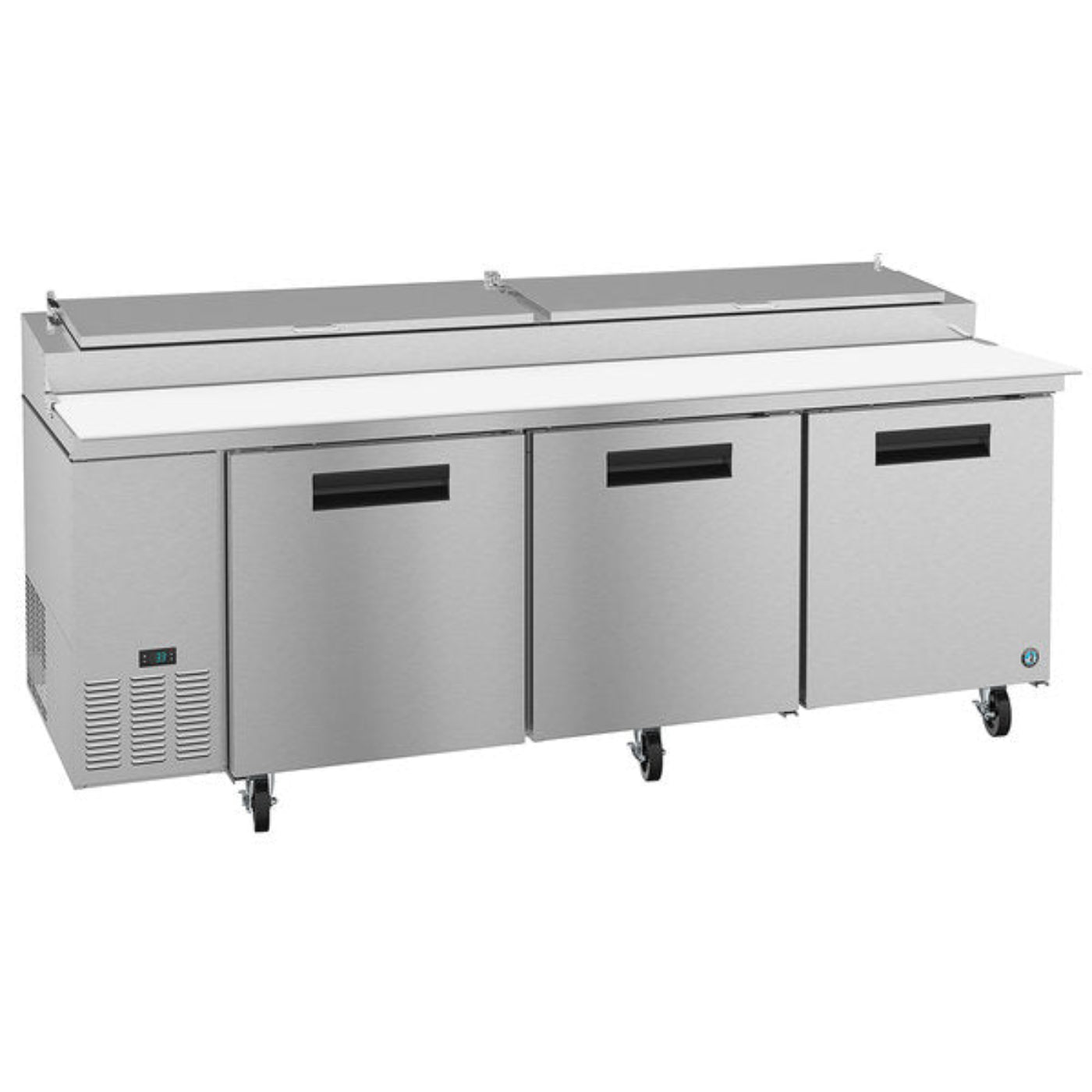 The PR93A Steelheart Series Pizza prep table, three section refrigerator with stainless doors. Engineered to maintain food safe temperatures in 100°F ambient conditions and with a net capacity of 30 cubic feet this front breathing prep table refrigerator is the right choice for hot kitchens. It features an adjustable ducted rail air distribution system to suit any kitchen.