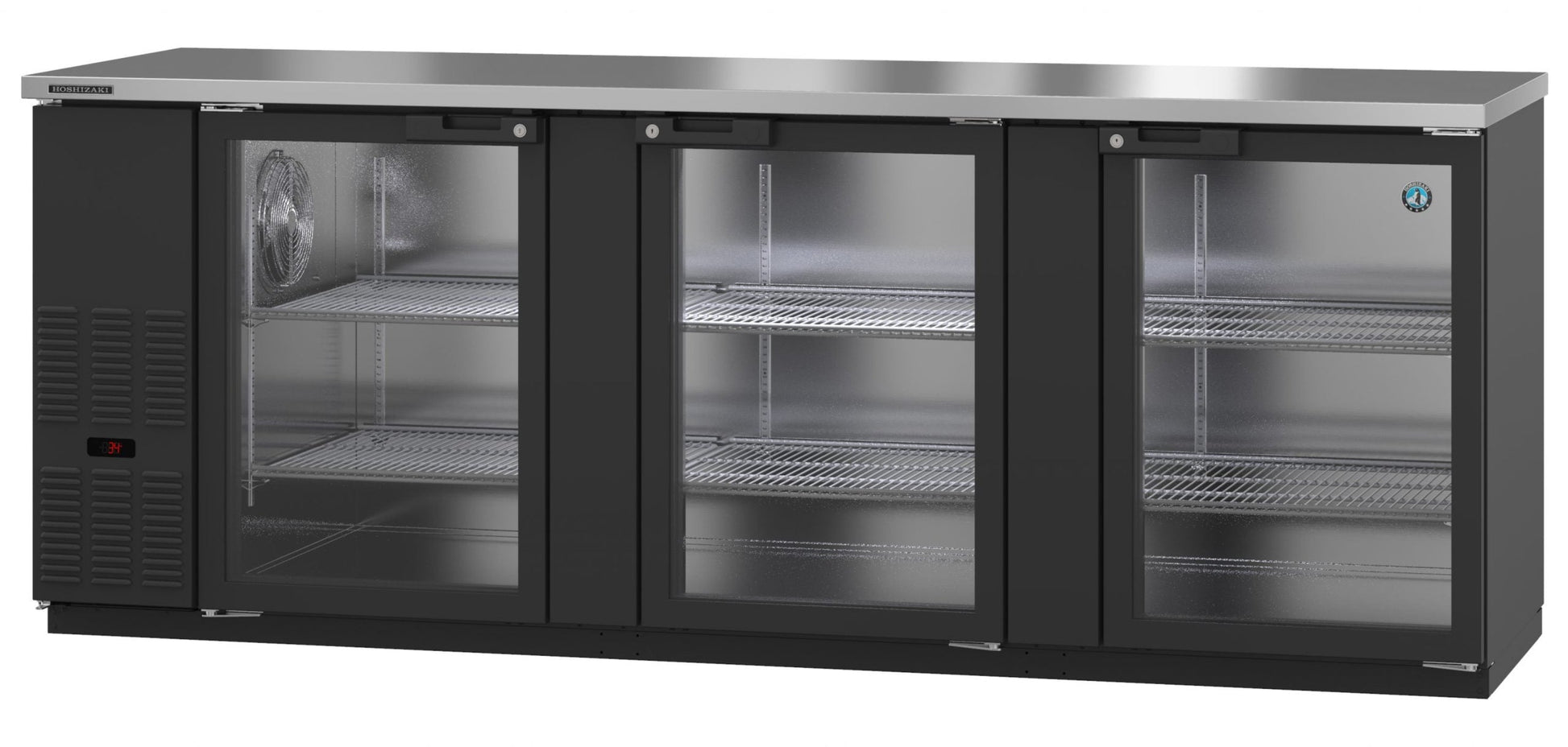 A: The Hoshizaki BB95-G is a 96" wide back bar refrigerator with three glass doors, designed for commercial beverage storage and display.