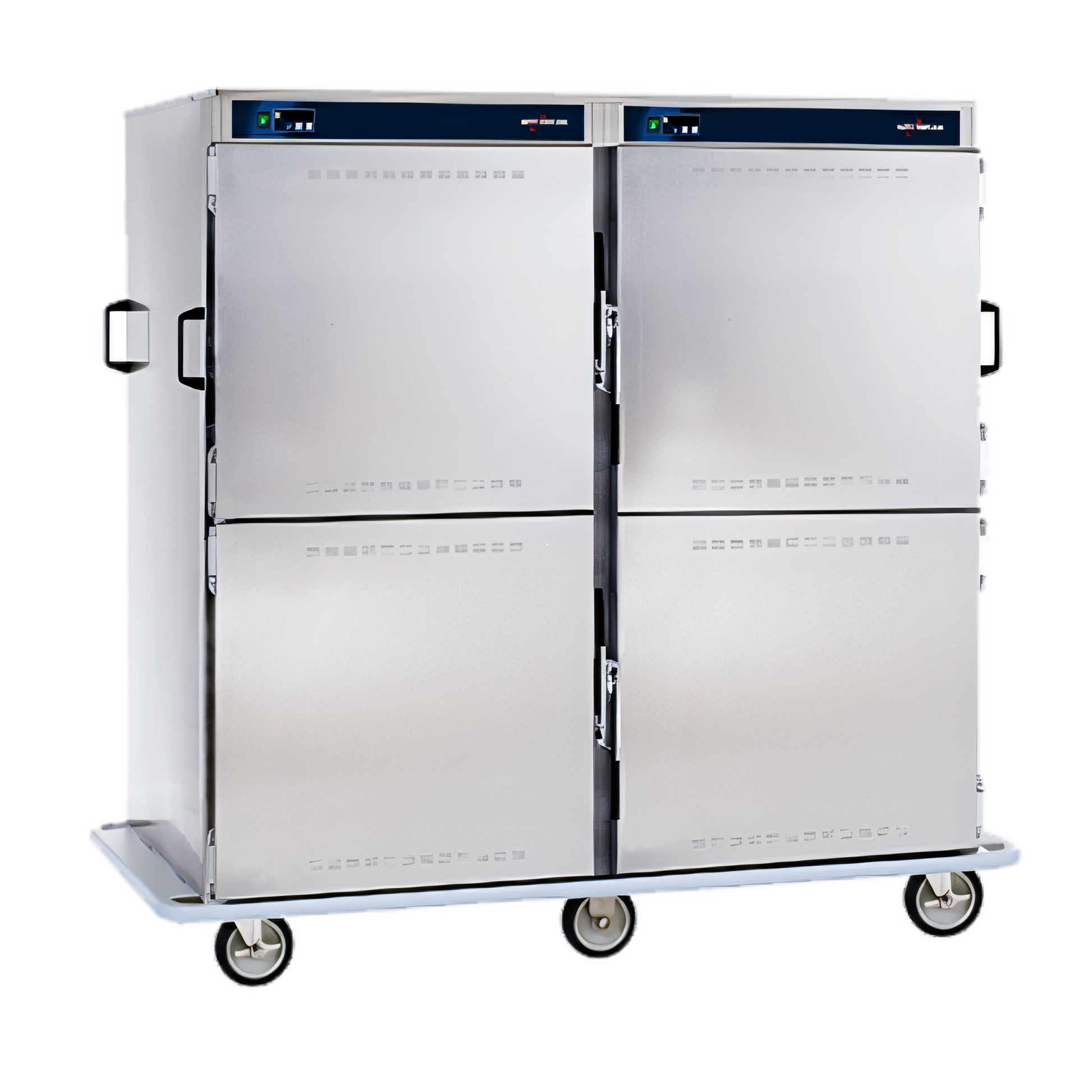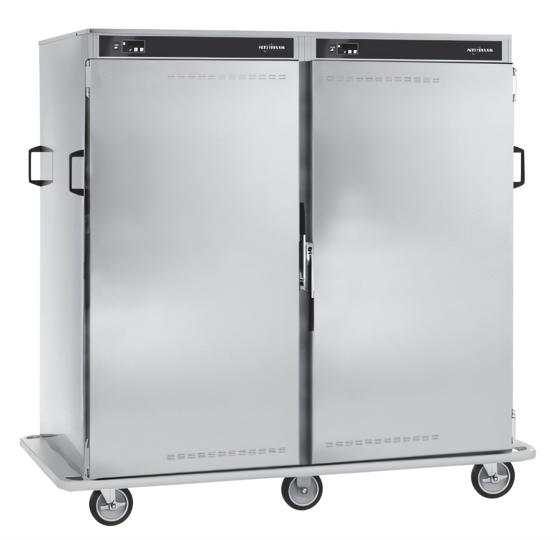 A: A high-capacity Halo Heat® banquet cart designed to hold and transport hot plated meals or pans for catering and banquet service.
