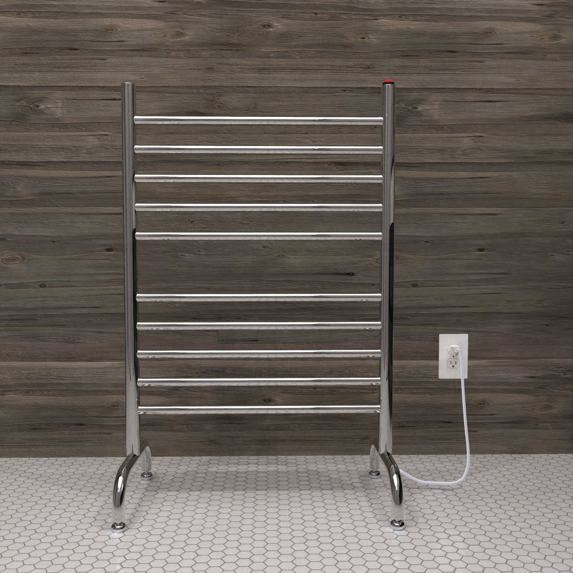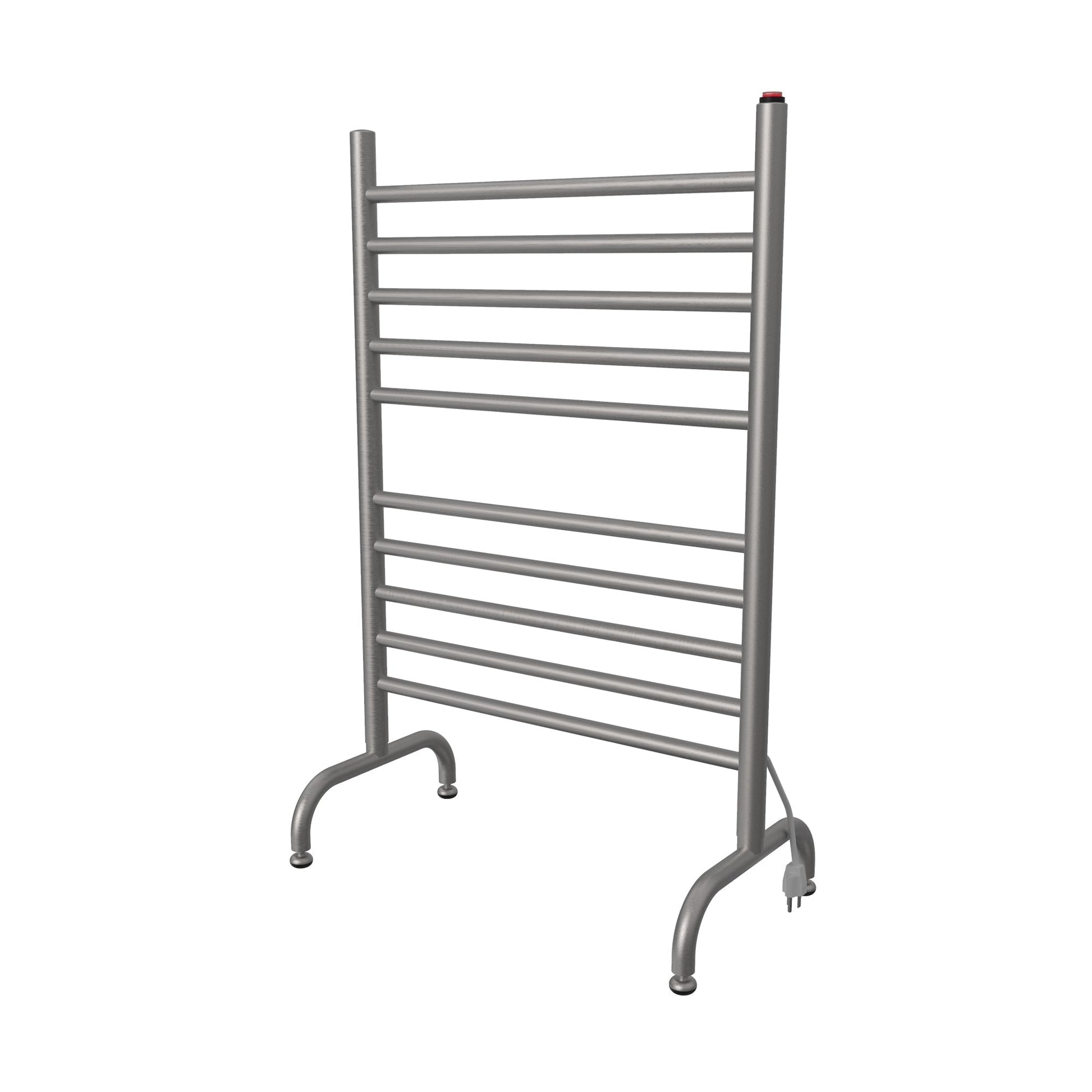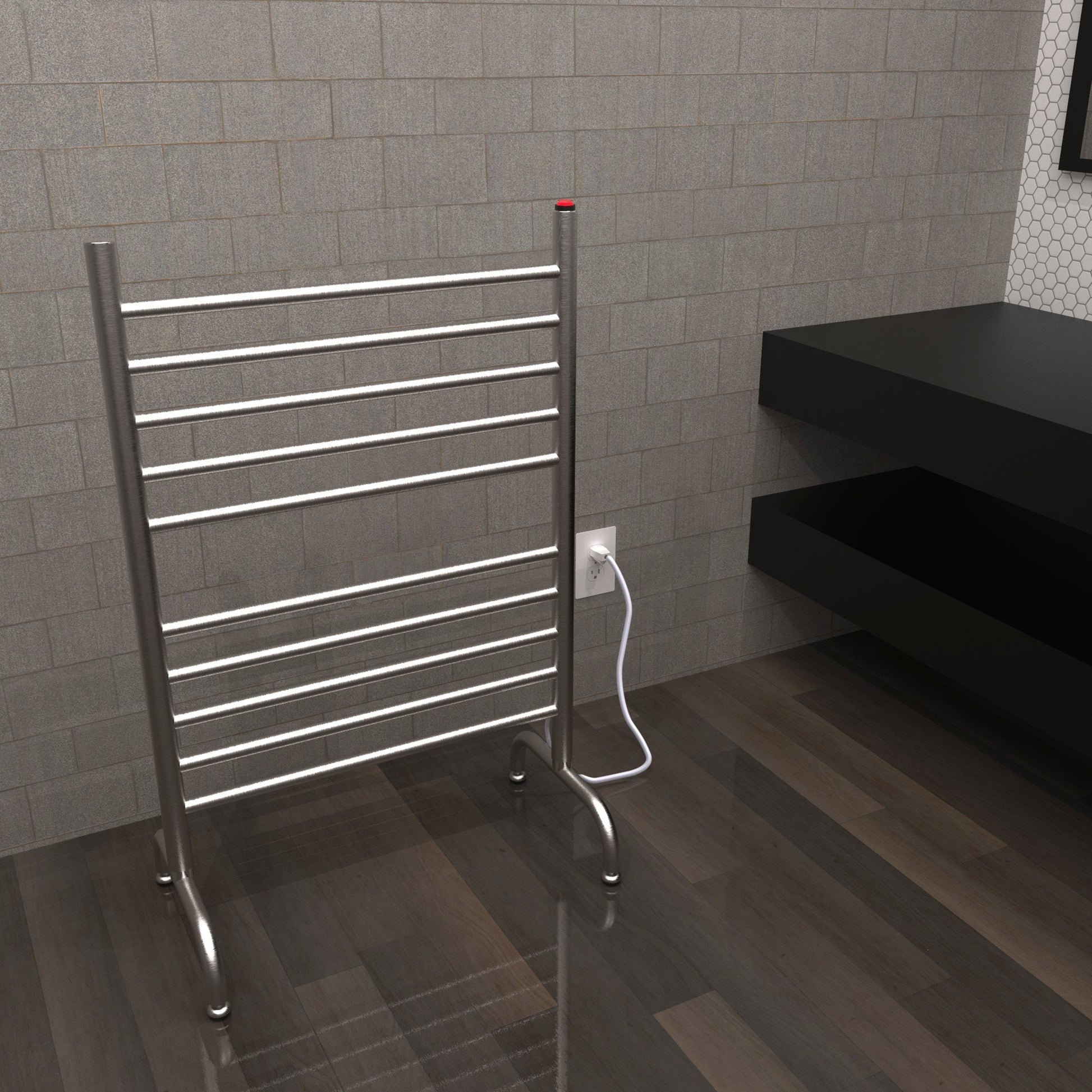 A: This model features 24 bars for optimal towel placement, durable stainless steel construction, an energy-efficient plug-in design, and a sleek, freestanding base that can be easily placed anywhere in your bathroom.