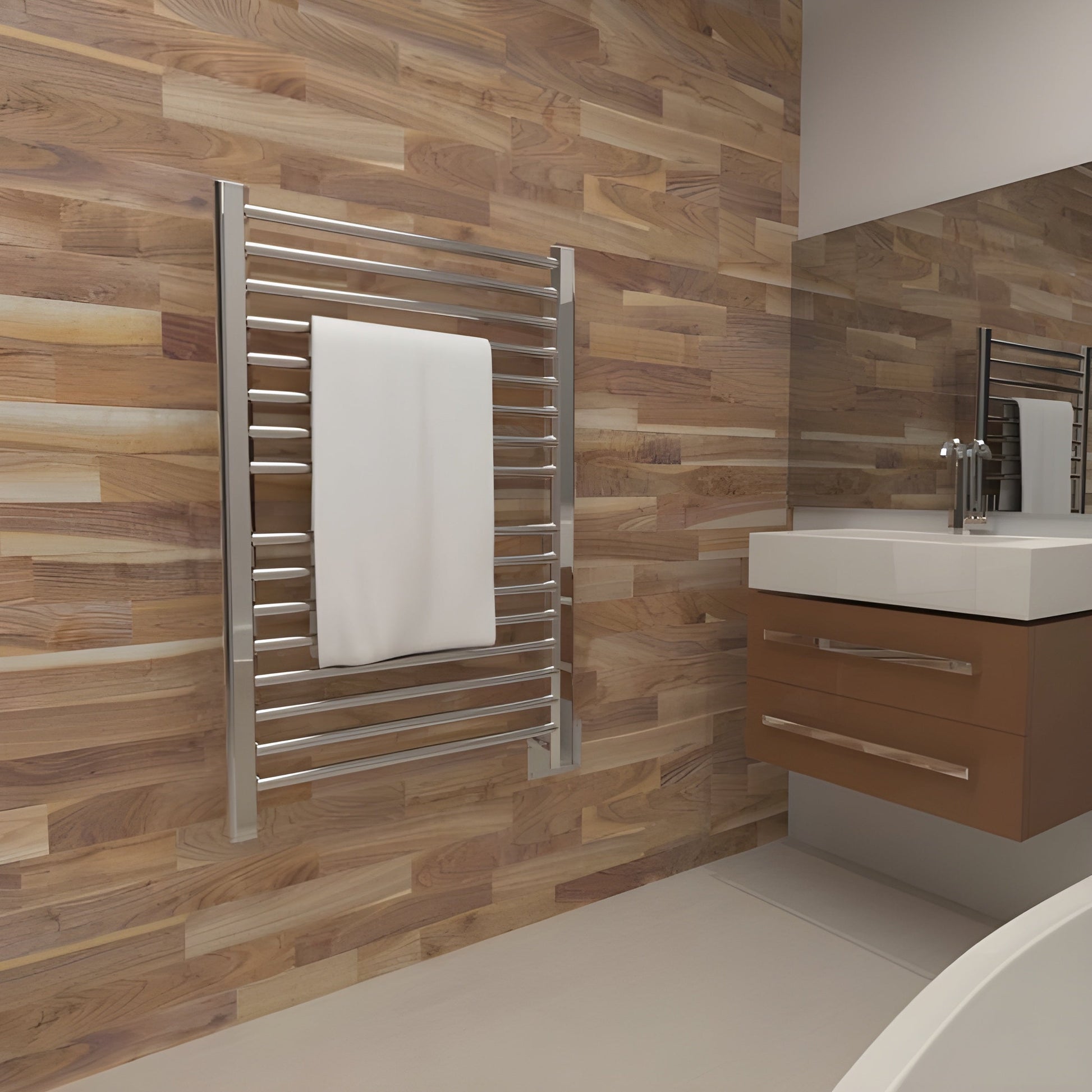 Sleek & Modern Design: The Amba S2942 Heated Towel Rack boasts a contemporary aesthetic with a height of 42 5/8″, making it a striking addition to any bathroom.