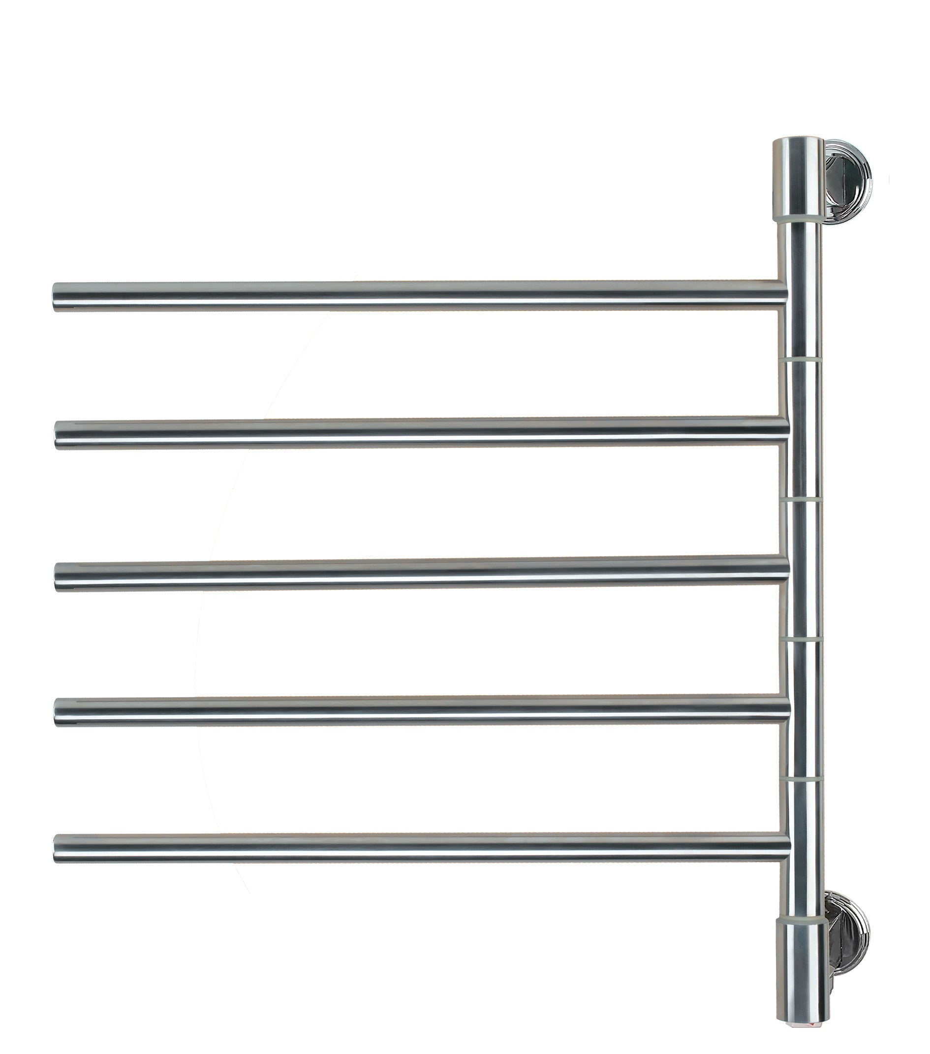 A: This model features a swivel mechanism that allows the bars to rotate for convenient towel placement and retrieval, durable stainless steel construction, energy-efficient heating elements, and a sleek, contemporary design.