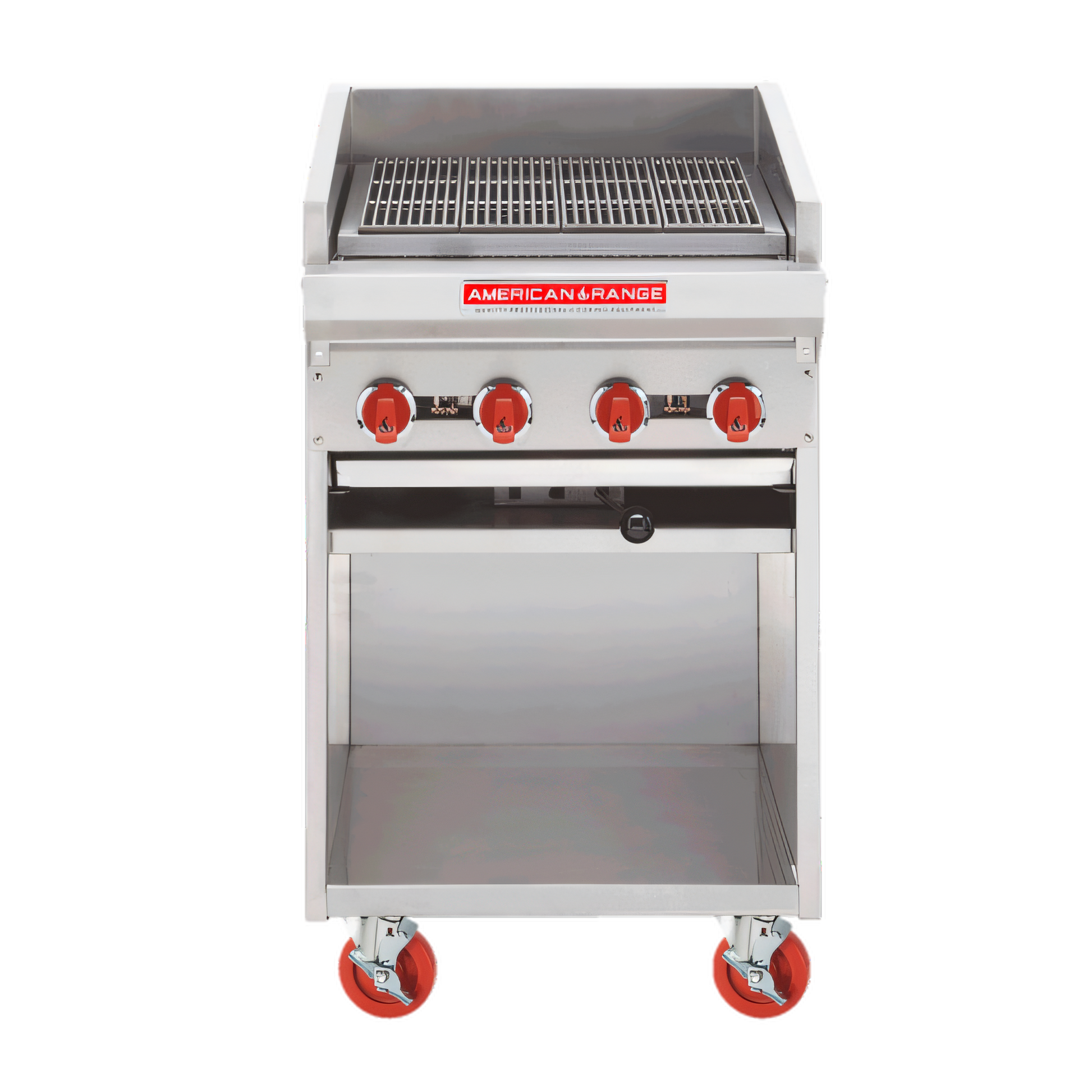 Put steak-house sear marks on steaks, burgers, chicken, and veggies—without giving up precious line space. The American Range ADJF-24 floor-model charbroiler couples four powerful burners with a tilt-adjustable cast-iron grate, delivering the flexibility and rugged durability serious commercial kitchens demand.