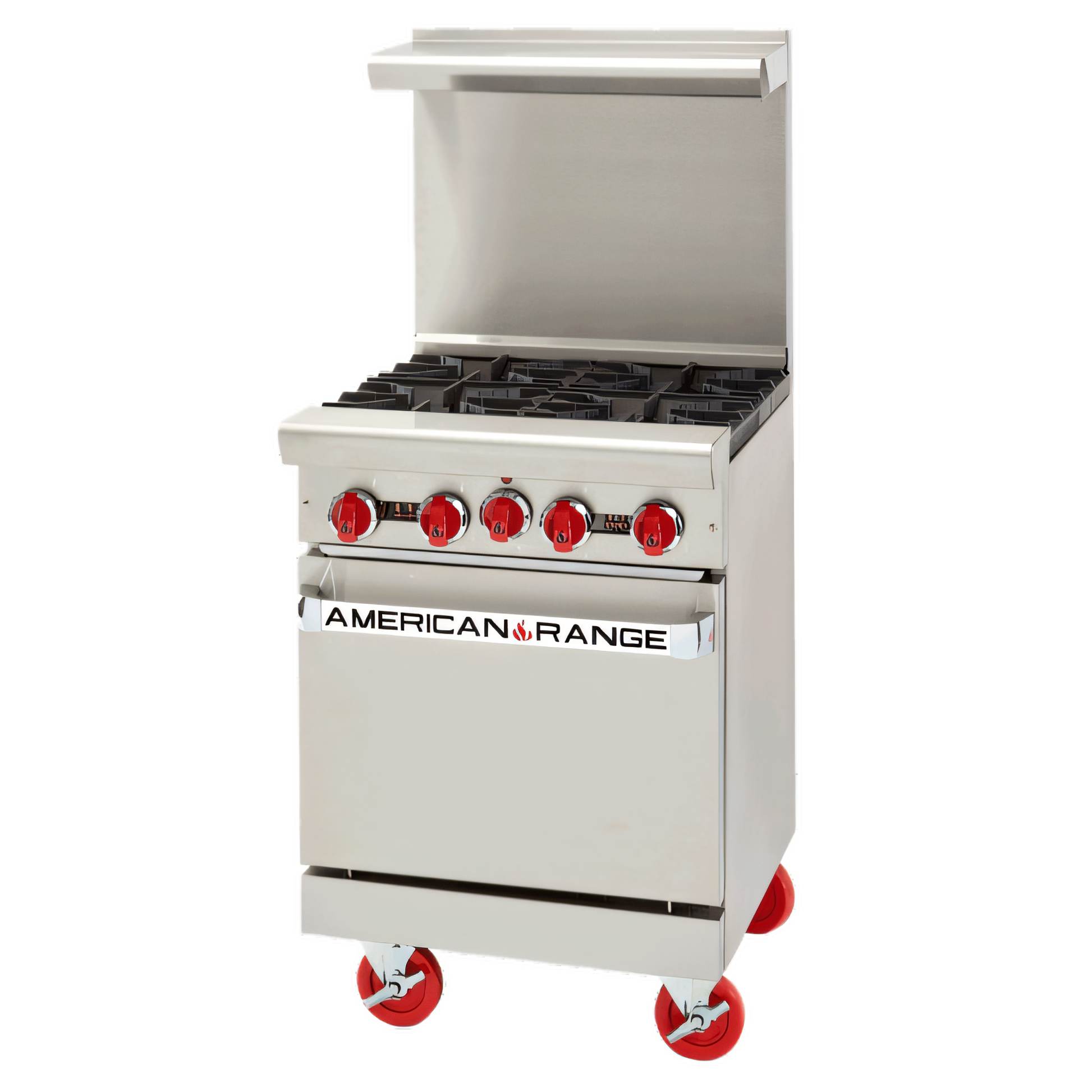 Built for demanding commercial kitchens that need power in a tight footprint, the American Range AR-4-SB packs four high-performance open burners and a convenient 20" storage base into a rugged 24" frame—all proudly made in the USA.