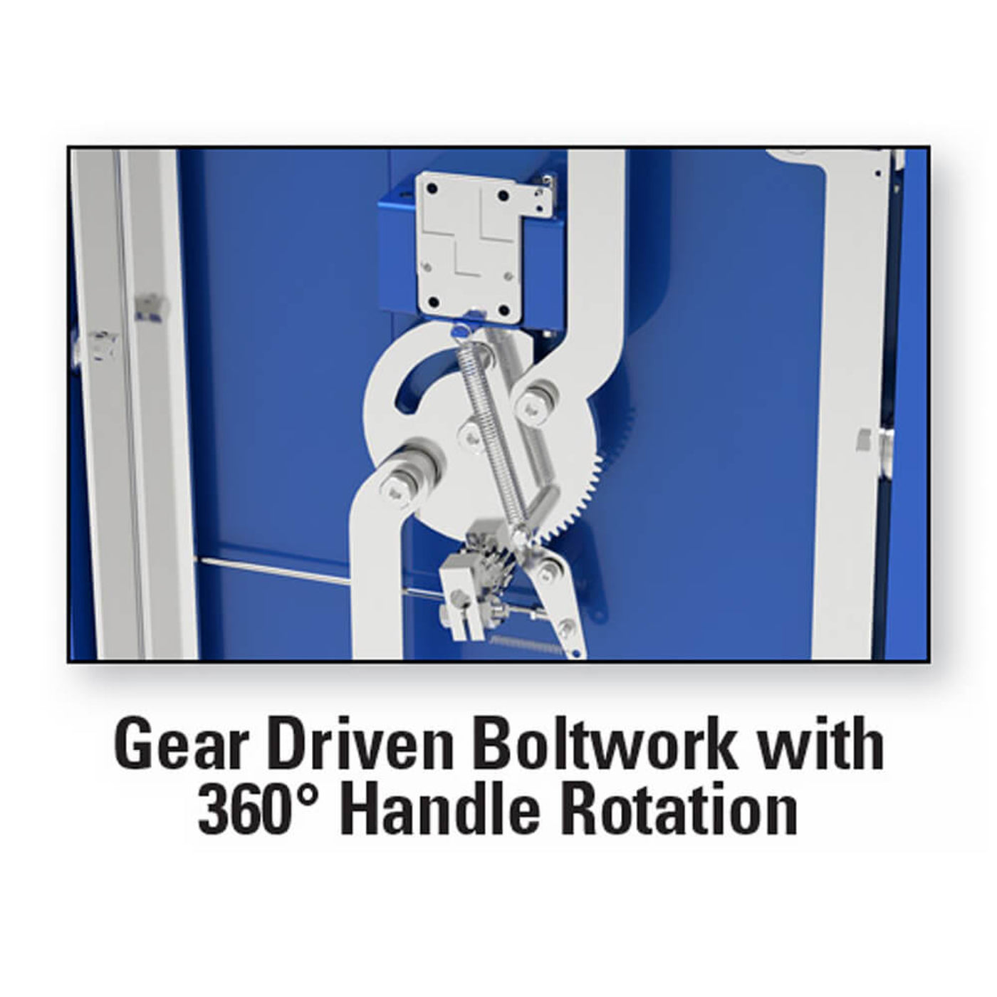 Once the correct combination is entered, the ultra smooth gear driven locking mechanism with increased handle rotation allows the door to open on the commercial grade, adjustable ball bearing hinges that can swing open a full 180°. As an additional feature, the handle will disengage under severe attack.
