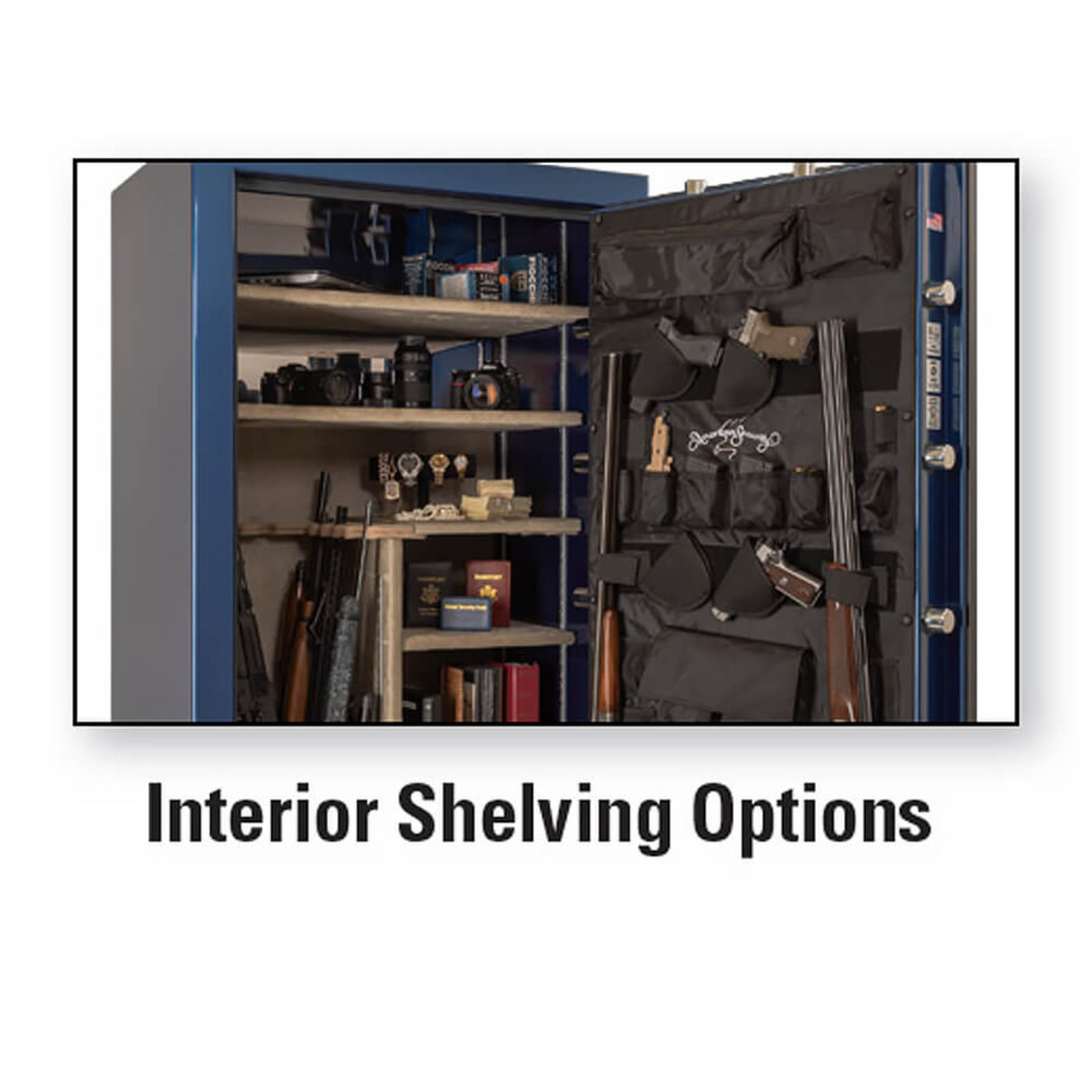 Once inside the AMSEC BFX6030, you'll first notice the beautiful mirrored back wall that provides increased visibility. Next you'll find the "All-in-One" interior that comes with two cover plates and 4 side shelves which allow storage on all sides of the safe. The included premium door organizer (PDO) maximizes storage space and offers quick access to commonly used items like passports, handguns and other important documents/valuables. There's also a standard built in internal AC power port with a removable external power cord that will allow you to charge your electronics or use a dehumidifying rod. The E-Z Slant-Out interior provides easy access to your long guns and the entire interior is upholstered in rich pin-dot gray fabric. New for 2023, Amsec has added some updates to the interior configuration inside the safe.