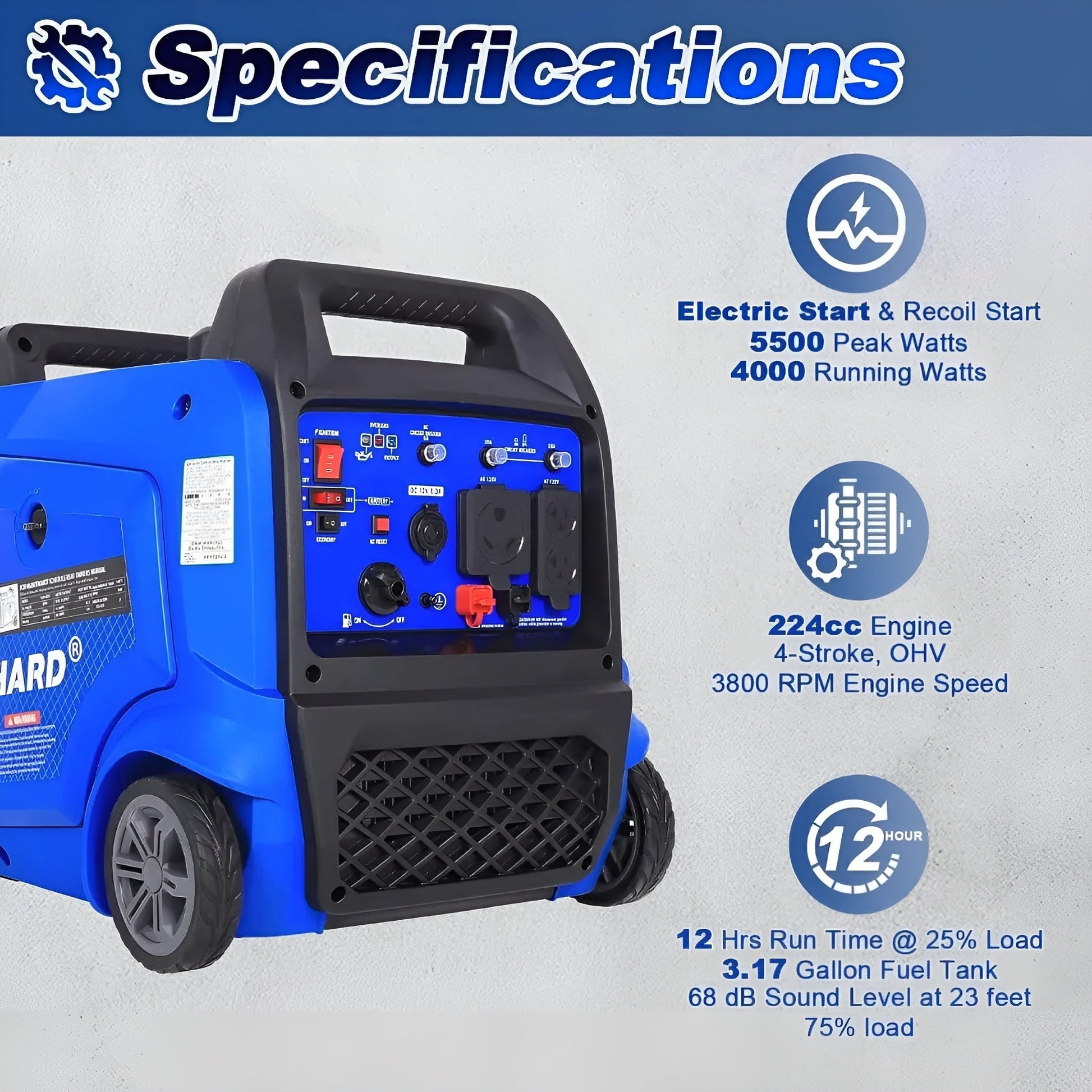 Begin your journey of energy mastery effortlessly with both electric and recoil start options. Delight in 5500 peak watts and 4000 running watts of pure excellence. Tailor-made for your RV, campsite, pole barn, worksite, and home, it's a generator that meets every need with elegance.
