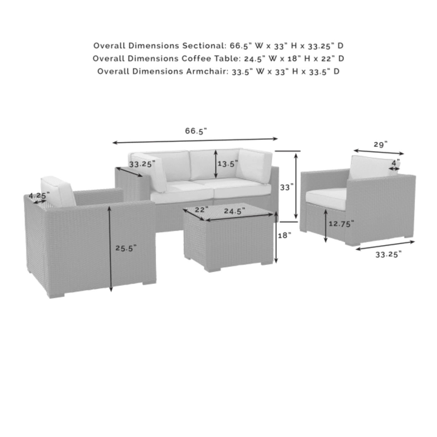 Entertaining outdoors is made effortless with the Biscayne 5pc Conversation Set. Stylish and durable, each piece of this set features all-weather resin wicker woven over durable powder-coated steel frames. Thick moisture-resistant cushions offer deep, comfortable seating, while the all-wicker coffee table adds a convenient spot for a snack or beverage. Ideal for an evening relaxing with friends the Biscayne conversation set is a must-have for your patio or deck.