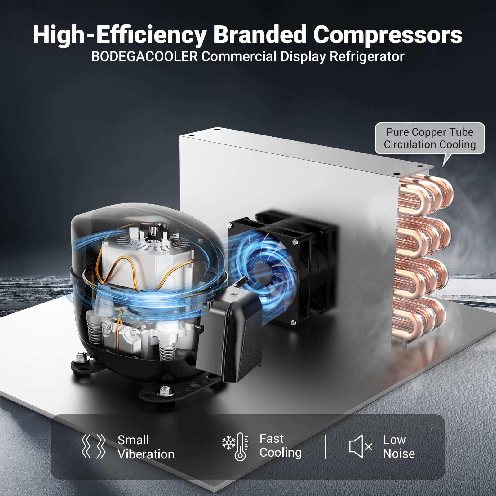 - Efficiently Cooled Commercial Fridge This commercial beverage refrigerator has a powerful cooling circulation system, equipped with advanced energy-saving fan motor and high-efficiency compressor,which not only effectively distributes the cold air and maintains a consistent circulation of cold air inside,but also effectively prevents odors from arising inside the commercial display refrigerator.1 to 7-speed mechanical knob temperature adjustment control,to meet your different temperature needs.