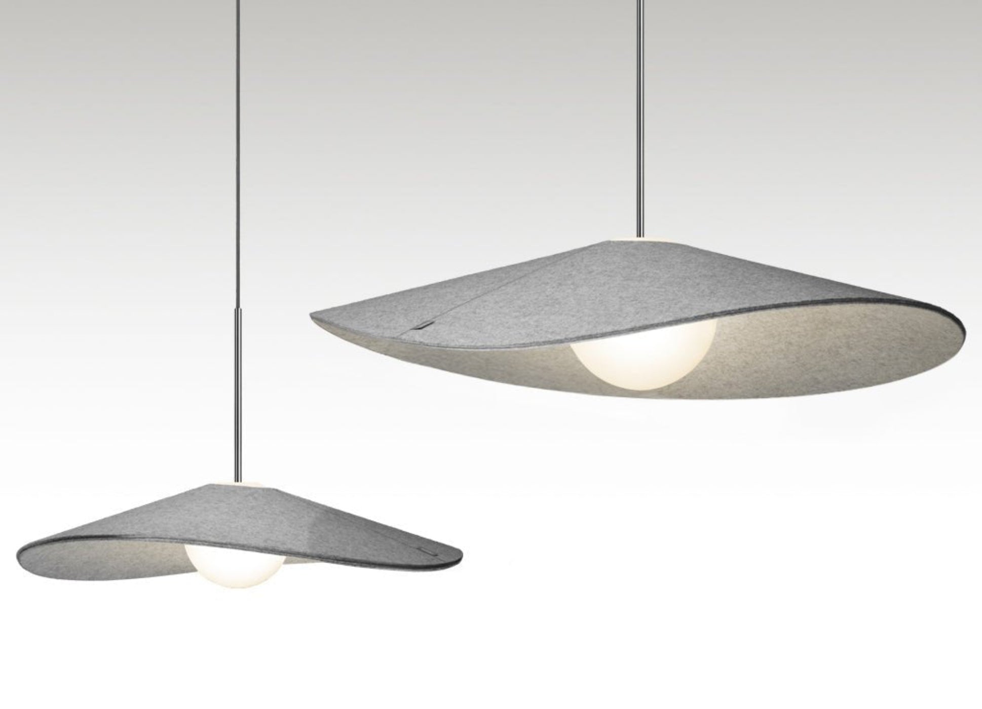 Bola Felt’s charmingly expressive felted shade hat features a soft and pliable conical structure with 2 colored layers of undulating wool inside and out. Available in 2 distinct sizes: 24” (61 cm) and 32” (81 cm), its shade rests elegantly over its opaline glass globe diffusor allowing the user to tilt the shade to multiple angles to focus light while taking on various relaxed personalities in the process. Bola Felt casts unparalled illumination boasting up to 1550 lumens of warm and