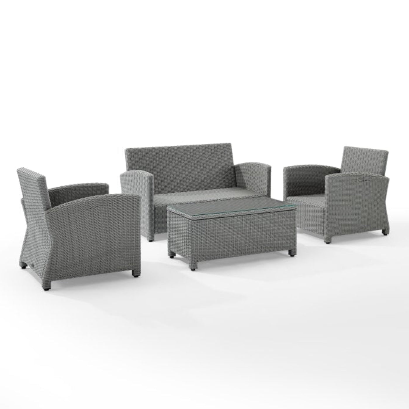 Whether you are lounging solo or entertaining a group, the Bradenton 4pc Conversation Set fits the bill. Each piece of the set features sturdy steel frames wrapped in beautiful all-weather wicker. Enjoy the look of bright white outdoor cushions worry-free. The loveseat and armchair cushions are covered in high-quality Sunbrella fabric that resists staining, discoloration, and mildew. A glass-top coffee table ties the seating arrangement together, making outdoor entertaining a breeze with the Bradenton conversation set.