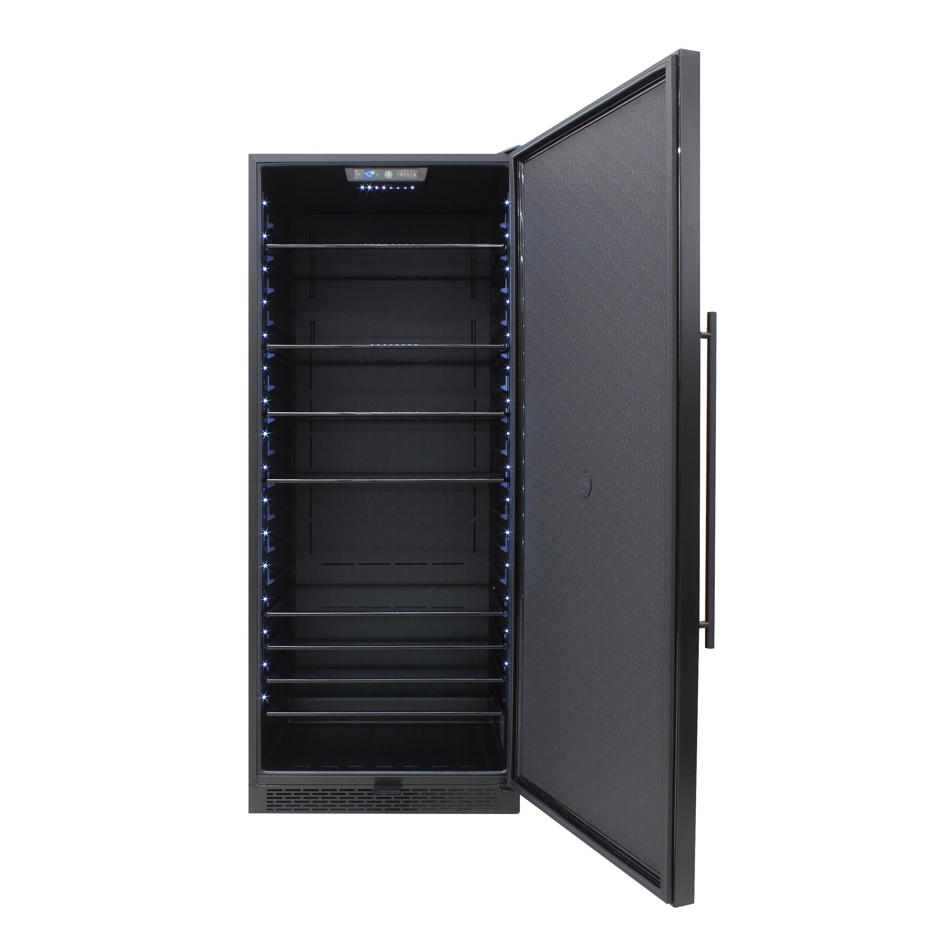 The Brama 300-Series Pantry Refrigerator features a sleek black cabinet body and door with a pole handle that makes this unit a great addition to any pantry or garage setting. Beautiful enough to place inside the home, we designed this refrigerator with added insulation to be able to be used out of sight as well. With special insulation in both the cabinet and the door, it can withstand the higher temperature changes in warmer or colder climates. With a single temperature zone, this unit is perfect for storing beverages at the right temperature. The glass shelves are designed for storage display inside the unit. The internal digital control panel makes setting the perfect temperature simple and enables you to store all of your goods under the exact same conditions. You can also turn the interior blue LED lighting on or off with a switch of a button. A front exhaust makes it simple to build this refrigerator into existing cabinetry of a garage, or it can also be used freestanding. Shelves can be adjusted to store various items in multiple configurations. Side-by-side installation with EL-300GFEB-L Garage Dual-Zone Wine Cooler (Left Hinge) gives you a left and right setting with matching wine cooler and refrigerator for your garage or pantry. Covered by the Vinotemp One-Year Limited Warranty.