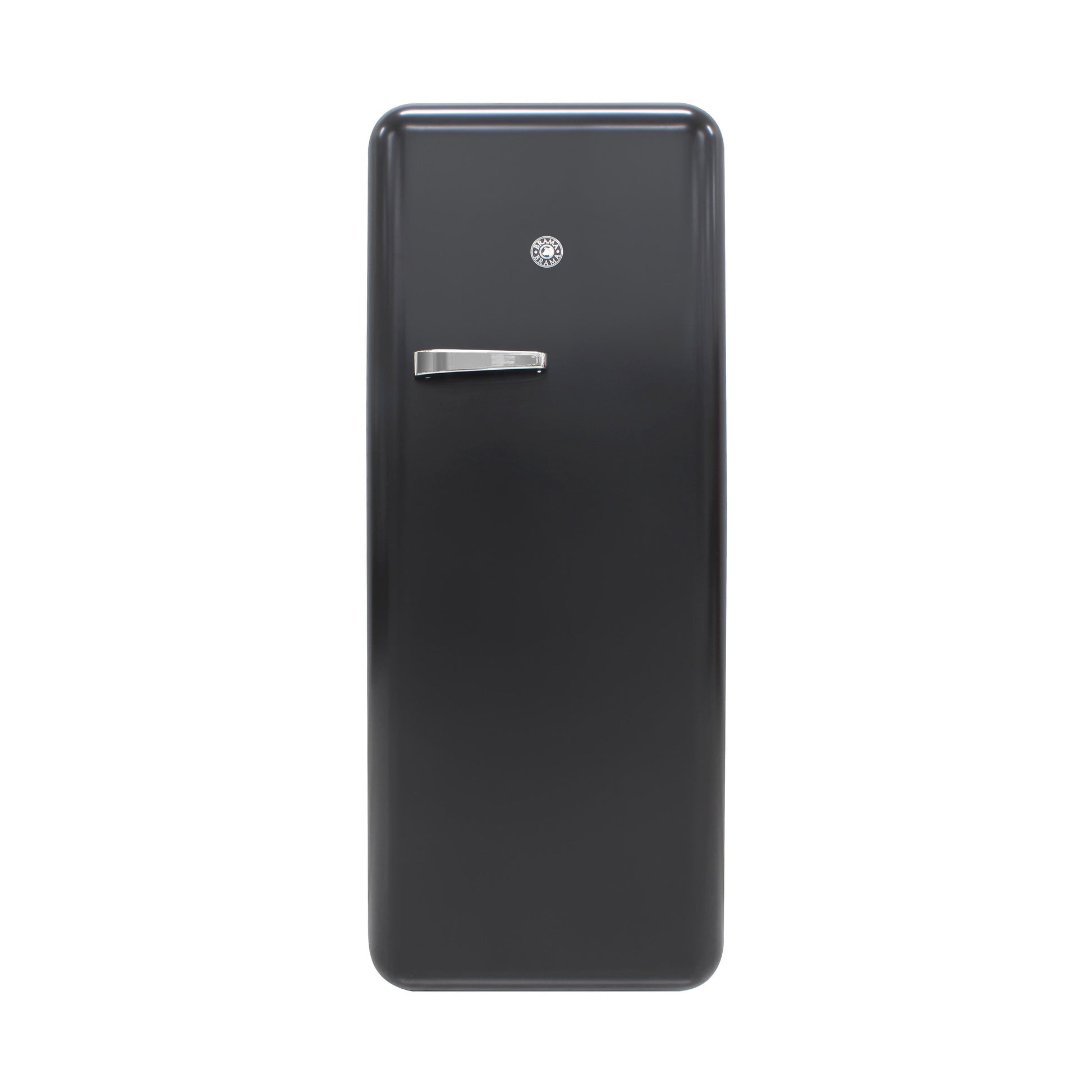 A: The refrigerator features a stylish retro-inspired design, finished in sleek black, adding a vintage touch to your kitchen or living space.