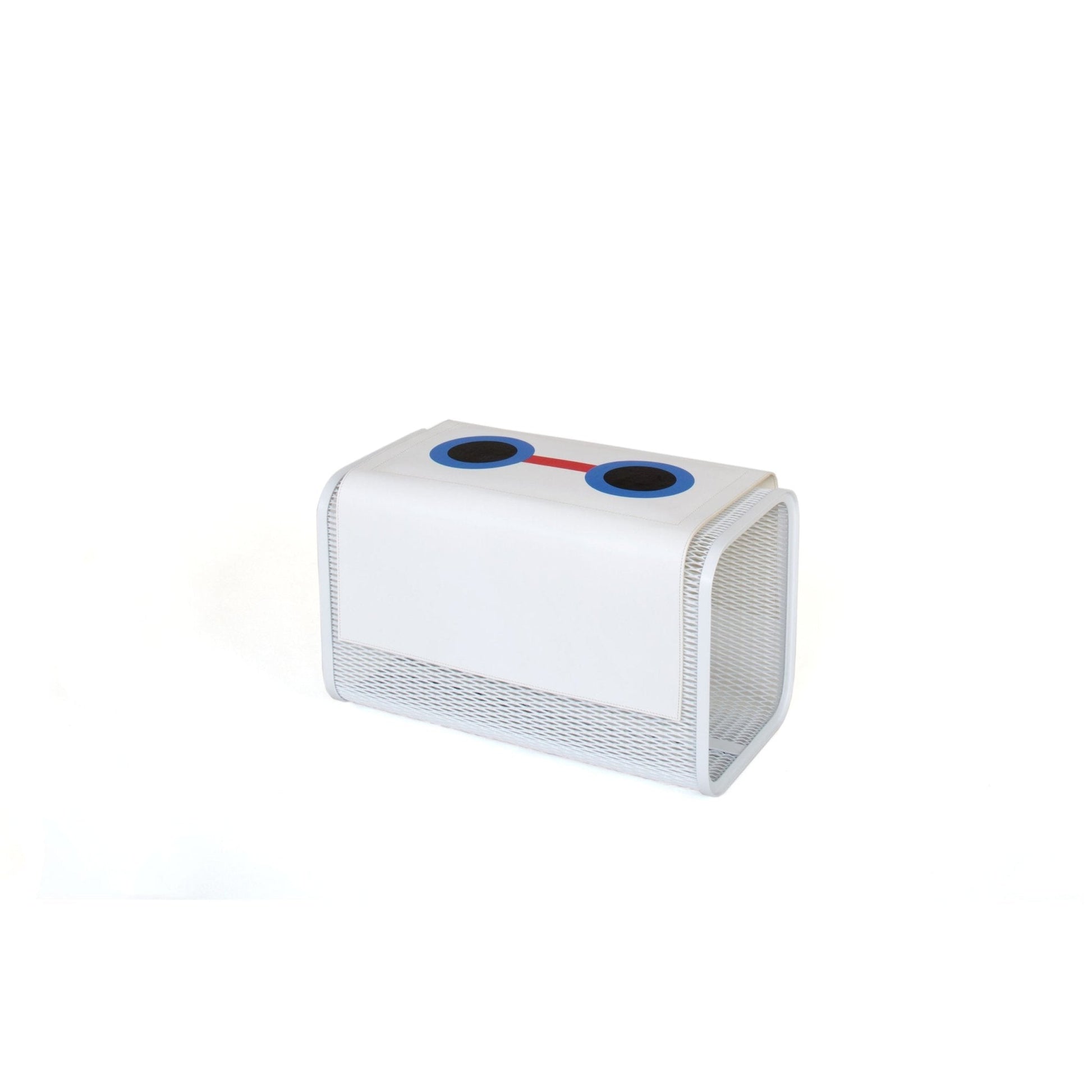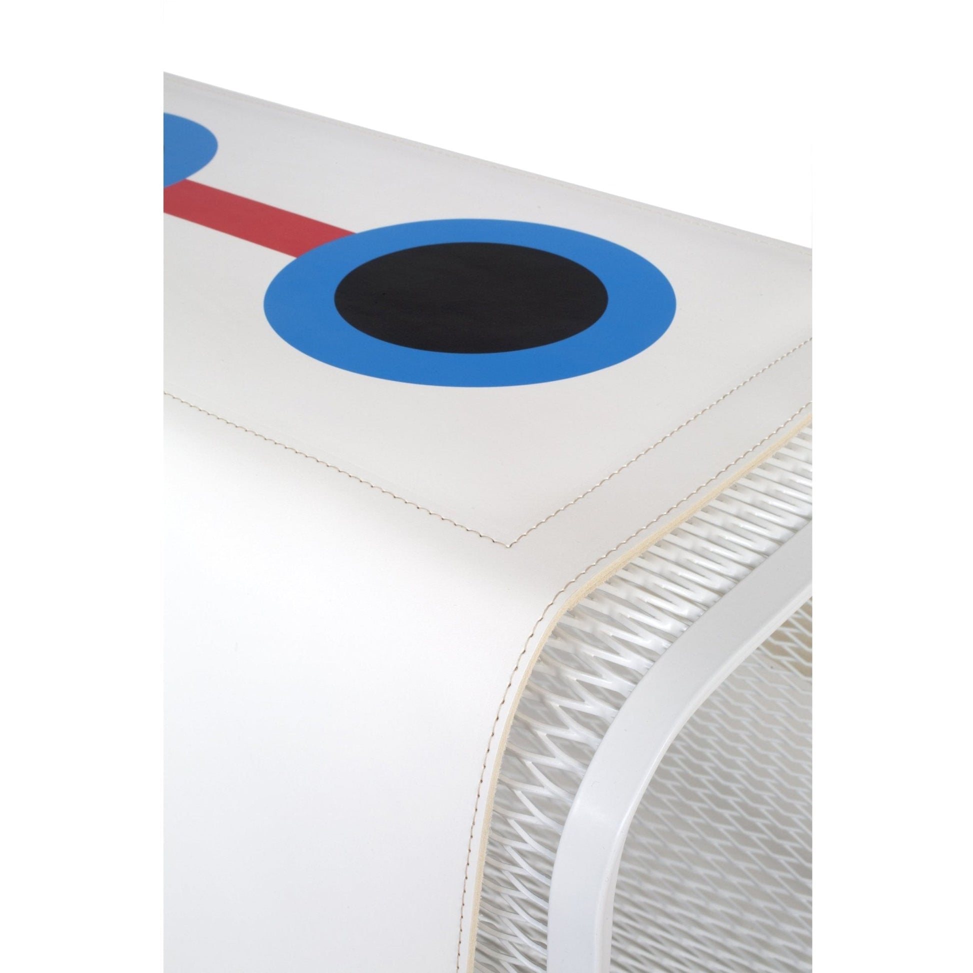 The Oscar Maschera Caballito Piccolo, designed by Nestor Perkal and reimagined by artist Nathalie du Pasquier, showcases an exceptional combination of abstract design and minimalist style. The piece features simple circles connected by a single line, creating a striking visual contrast against the white leather and metal mesh base. It serves as a versatile addition to any interior, functioning seamlessly as both seating and a table, making it ideal for both domestic and commercial spaces, where modern elegance and functionality are paramount.