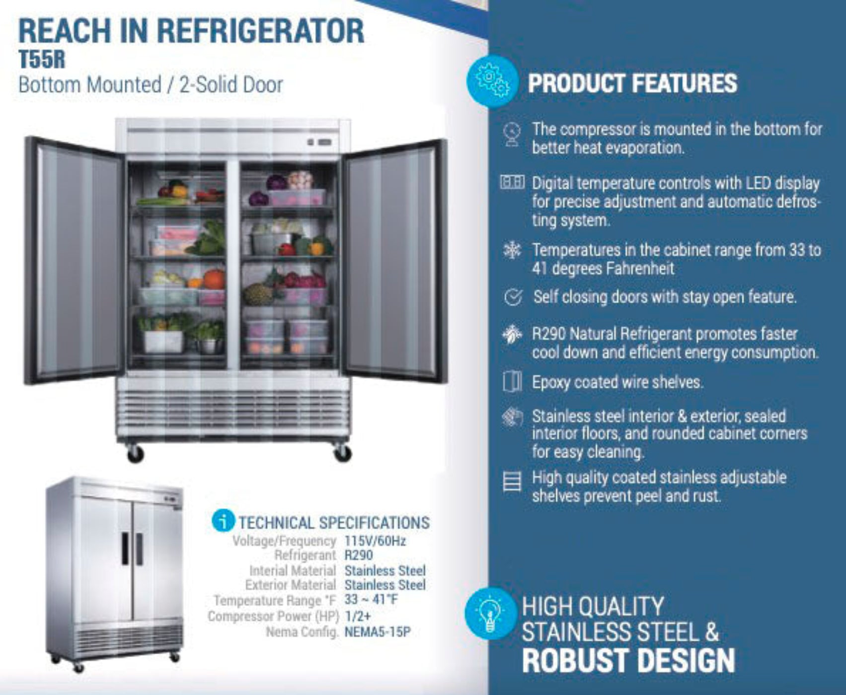 55" double solid door reach-in refrigerator with 40 cu.ft. capacity.