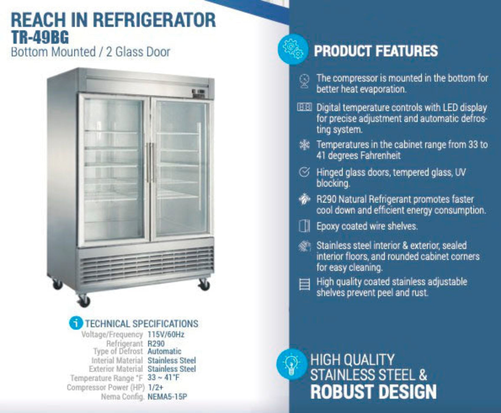 The Chef AAA TR-49BG reach-in commercial refrigerator is designed to suit the needs of any business who needs optimal performance without sacrificing design. Its’ two tempered glass doors are accented with high-quality brushed stainless steel for both the interior and exterior to fit a variety of decors. Recessed door handles allow for clean styling and better ergonomics. The heavy-duty compressor is bottom mounted for excellent efficiency and cooling. Digital controls fine-tune the desired interior temperature. Self-closing doors free up your hands for added convenience and ease of use. Auto-defrosting provides lower energy costs and colder temperatures. The included 8 shelves can be adjusted or removed for flexibility and maintenance. Easily move and position with four swivel casters.