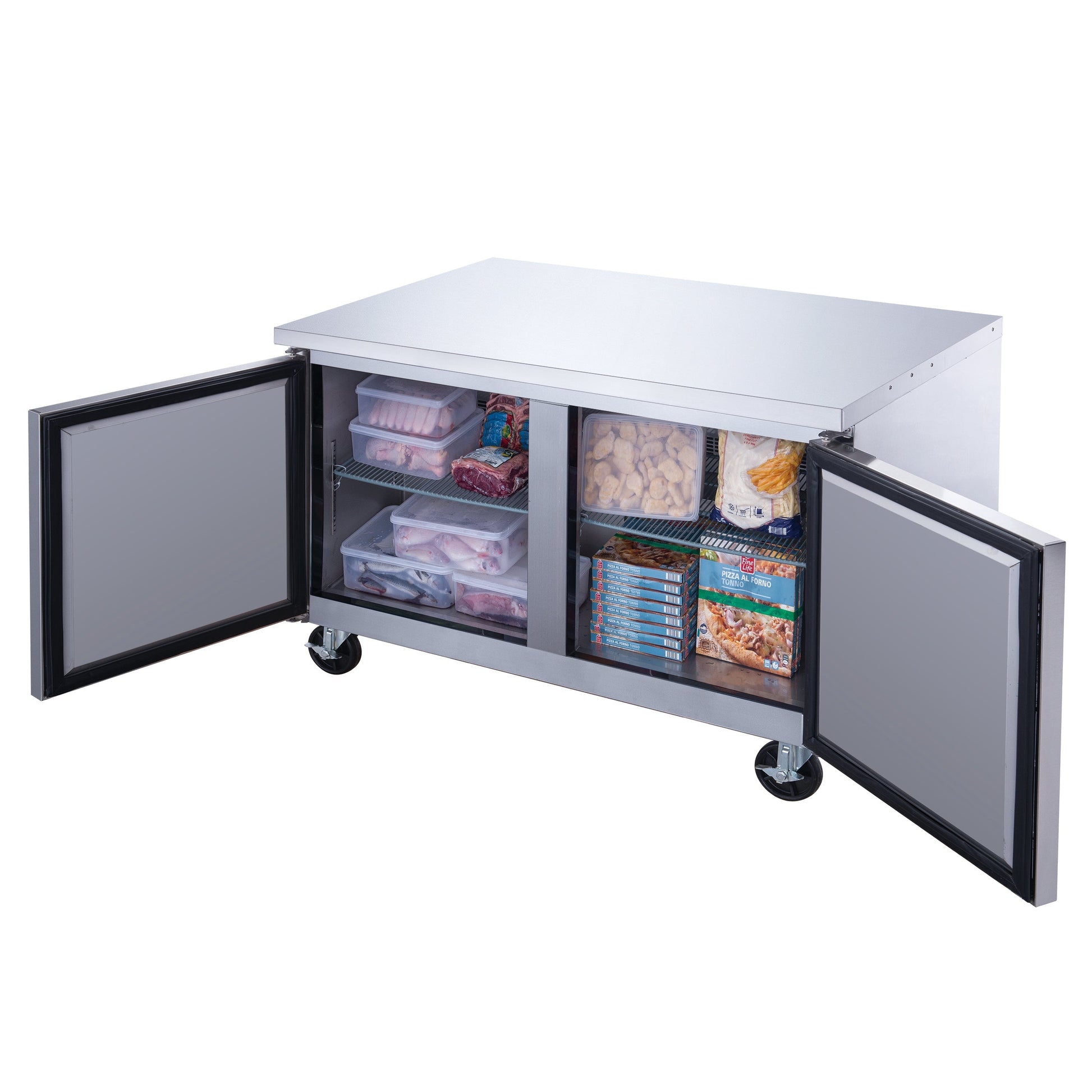 The Chef AAA - TUC60F undercounter freezer has a spacious capacity and all over brushed stainless steel construction. With a temperature range of 0 to -8°F, it chills and safely stores all type of food to sub-zero temperatures. Digital temperature controls and LED display lets you precisely pick the desired temperature. Designed with a bottom mounted 1/2 HP compressor for efficiency. Includes 2 adjustable and removable wire shelves.