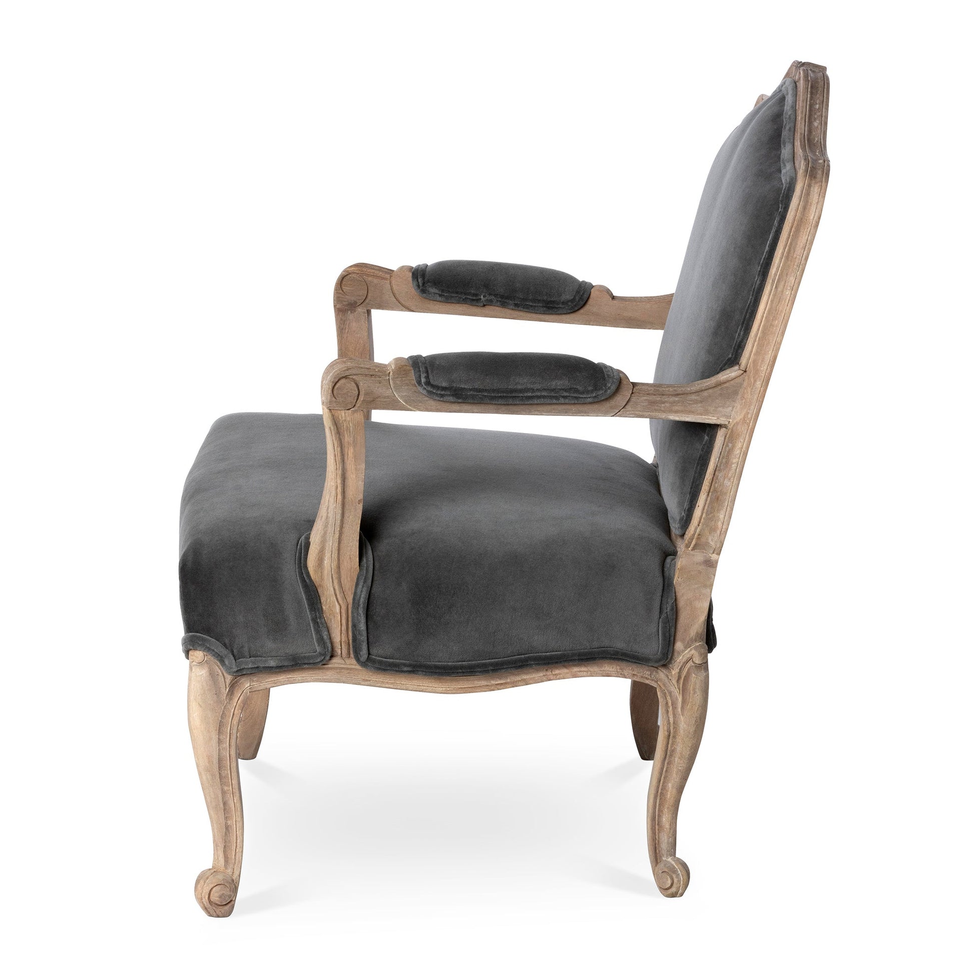 The combination of charcoal grey velvet and a light mango wood frame in the classic Louis XV style gives this armed chair a perfect balance between elegant and provincial charm. Our Chloe Velvet Upholstered Arm Chair is perfect as a head of your dining table or an accent chair in your sitting room..