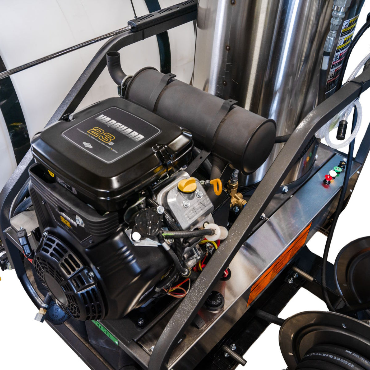 A 23 HP Vanguard gas engine with electric start from Brigss & Stratton powers this pressure washing system. It does a great job of powering the system. A heat tube produces hot water, which is fed in through the large storage tank.