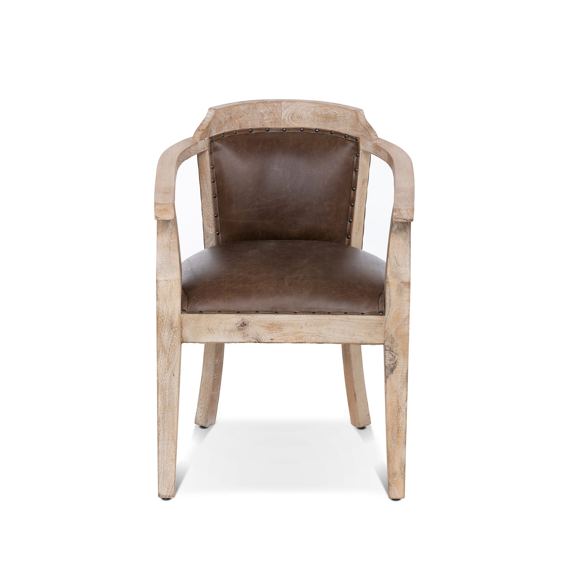 Our Colton Occasional Chair is a hand-crafted seat. The natural mango wood is lightly whitewashed, its curved frame and high arms expertly assembled. The light wood is juxtaposed by dark brown, aged buffalo leather secured with iron nail heads. This striking contrast makes this chair the perfect design accent in a modern rustic space.