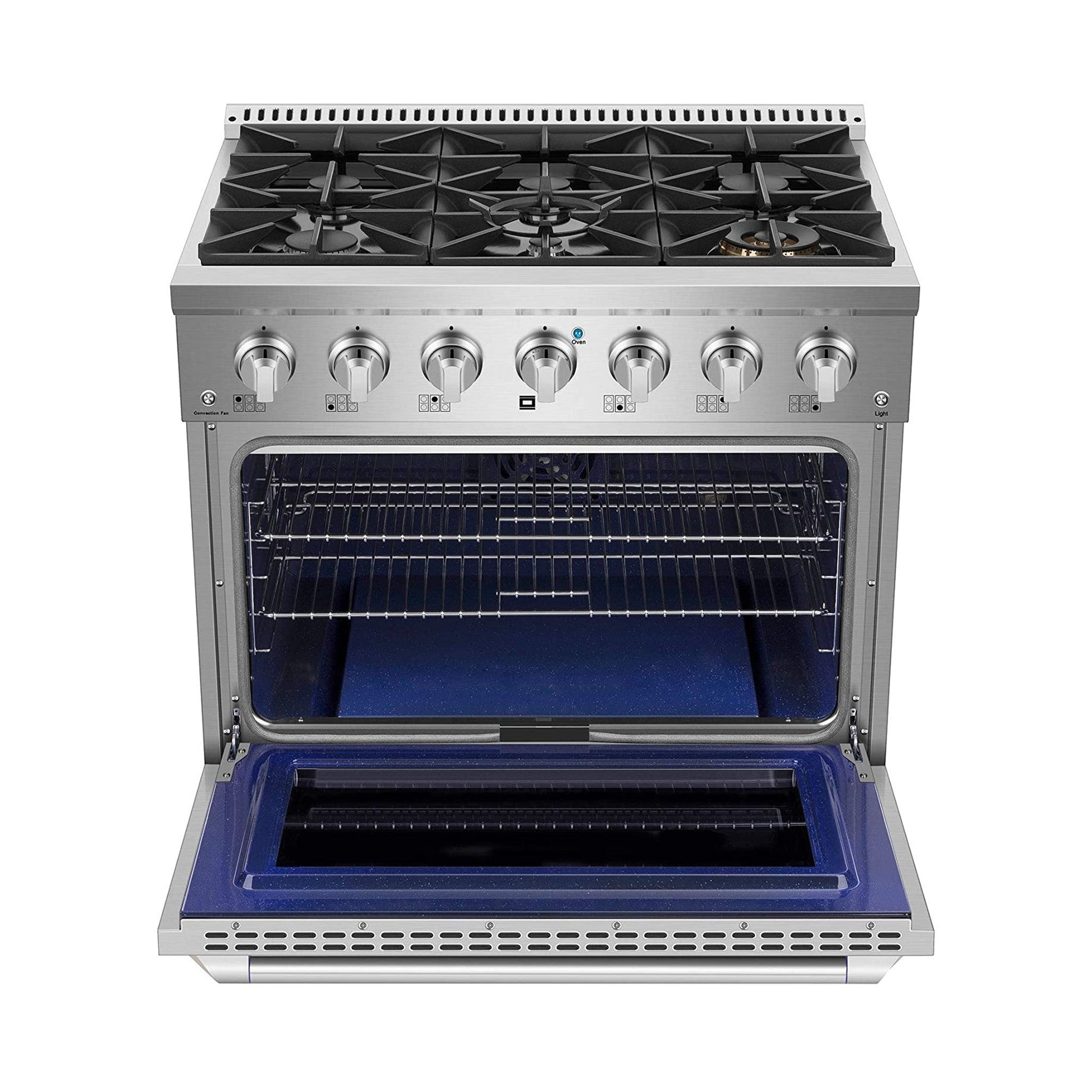 High BTU 6 Burners - High-performance gas burners which allow you to cook from a high heat for boiling, frying, or searing to a low simmer for delicate sauces. Includes two 15,000 BTU rapid burners, one 12,000 BTU and two 9,000 BTU semi-rapid burners with one 6,000 BTU axillary burner.