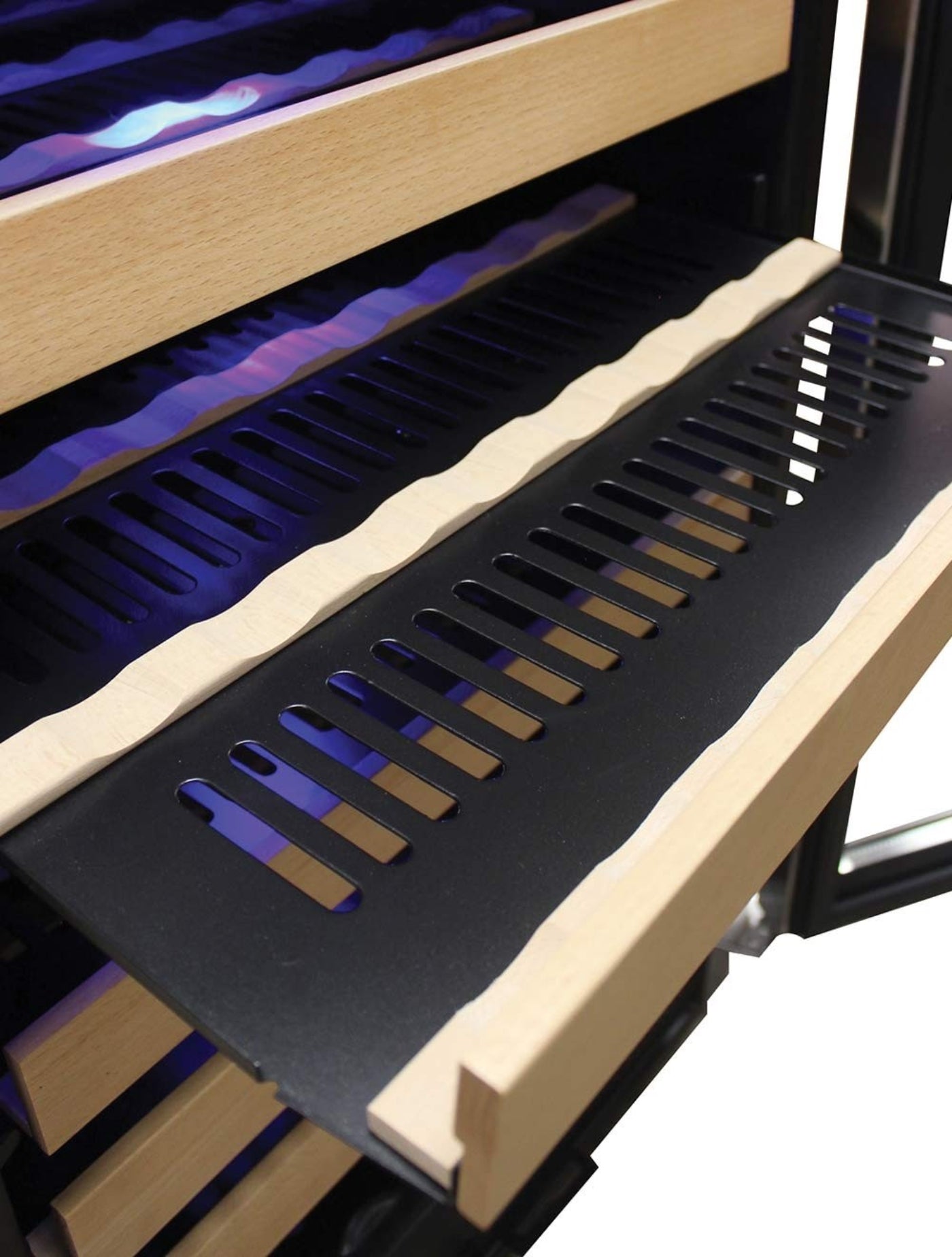 Set the right temperatures for your red and white wines with simple digital buttons. Top LED light illuminates your wine bottles inside the insulated glass door.Close-up of Wine Shelves with wooden lip