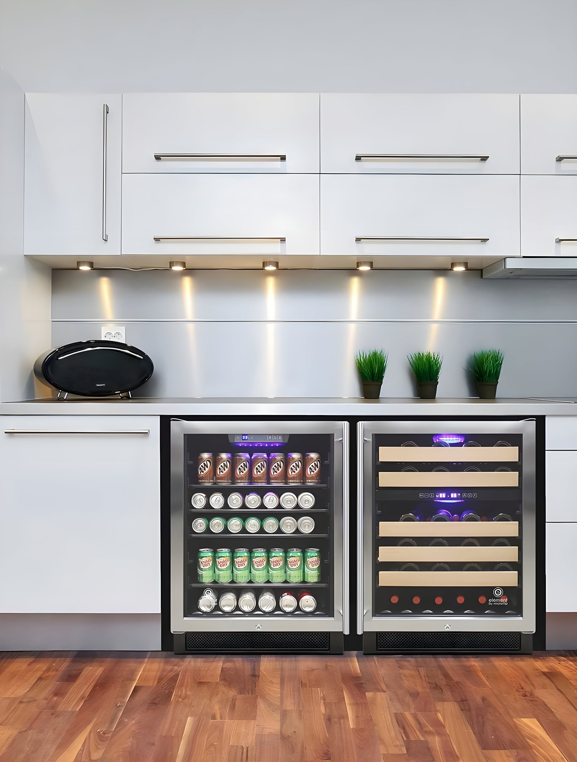 The Connoisseur Series 46 Single-Zone Beverage Cooler is an essential for those who love to entertain. Equipped with front exhaust, this beverage cooler is designed to fit seamlessly in existing cabinetry. The easy to use digital control panel makes adjusting the temperature simple while providing peace of mind that your beverages are always ready to be enjoyed. The blue LED lighting illuminates the cooler’s contents behind a seamless stainless steel door, making this beverage cooler an aesthetically pleasing addition to any room. Sliding tempered glass shelves holds approximately 161 12 oz. cans. Beautiful and functional, this beverage cooler is sure to be the centerpiece of get-togethers for years to come.