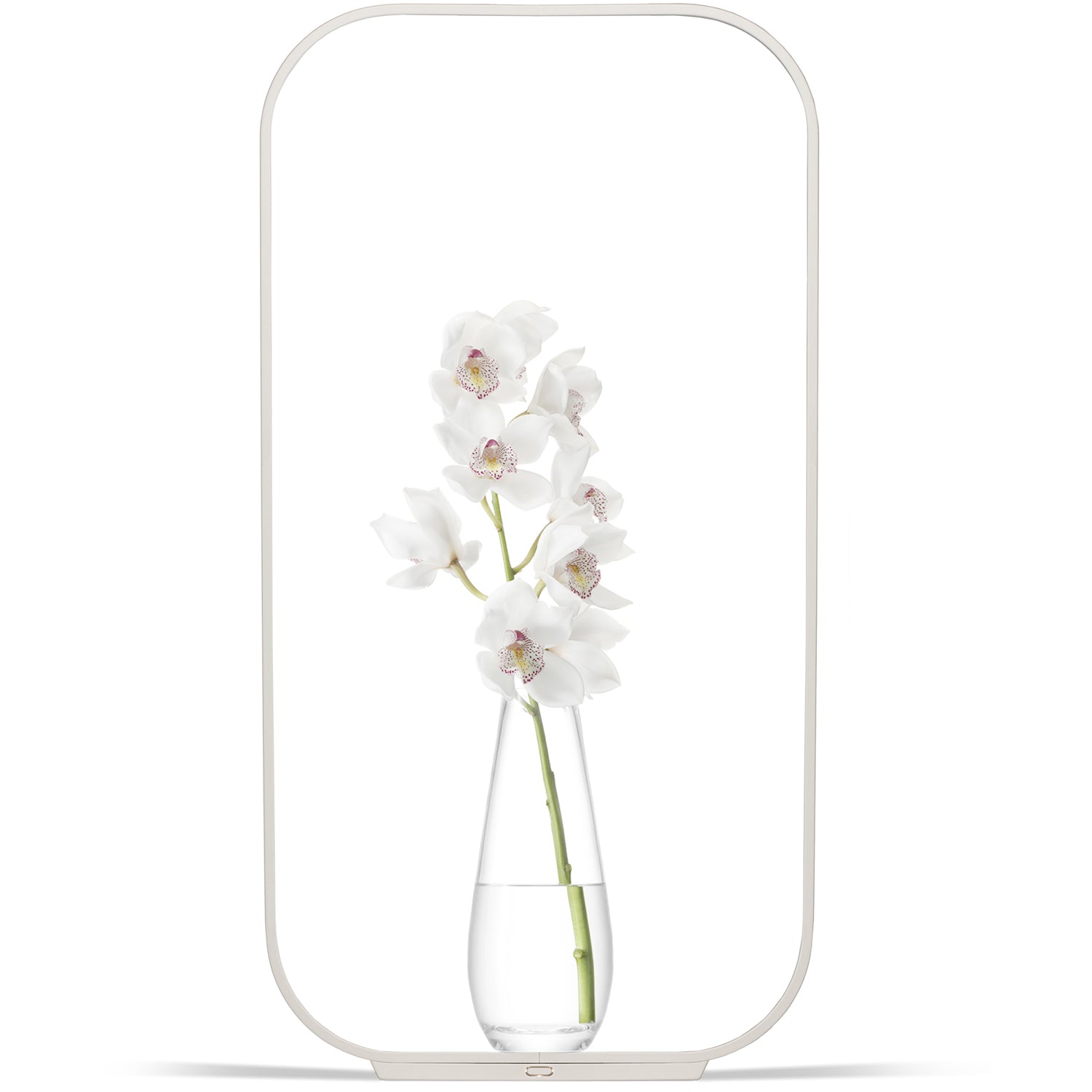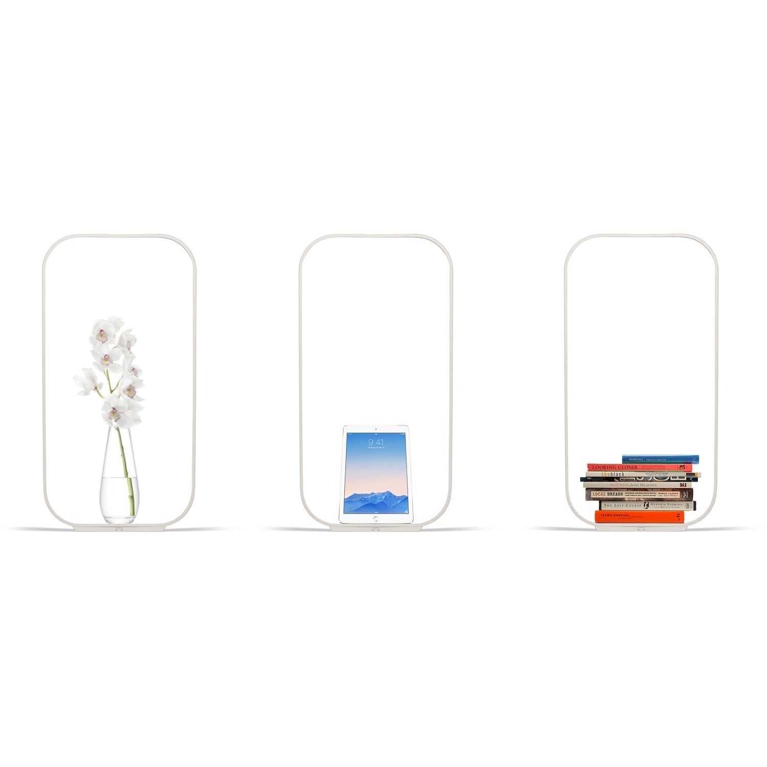 A: A modern LED table lamp with an open-frame design that combines illumination with functional display space.