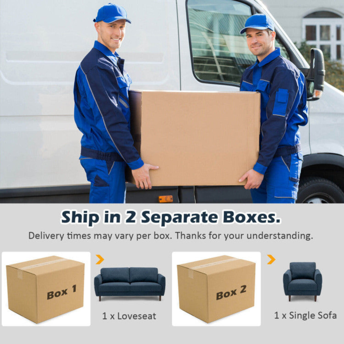 • About Delivery and Dimension: This loveseat and single sofa chair set are packed in 2 boxes, and the arrival time may vary per box. After receiving the packages, all you need to do is to assemble the sofa legs (stored under the sofa frame). The overall dimension of the loveseat is 72" x 35" x 34" (L x W x H); the overall dimension of the single sofa is 34" x 35" x 34" (L x W x H).