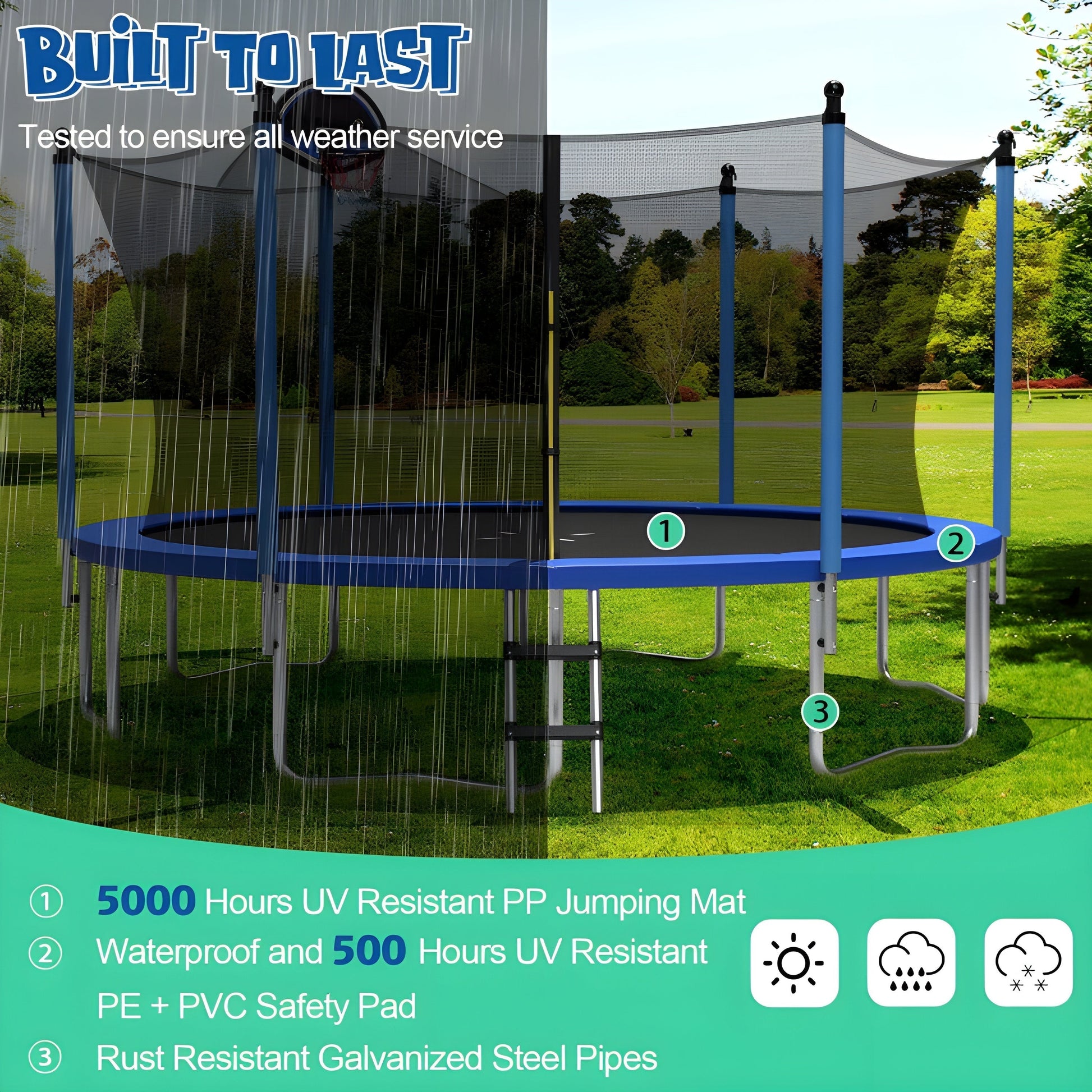 Jump Higher and Safer: The high resilient PP jumping mat is connected to the frame through heavy duty drum shaped springs, and has passed 300,000 bouncing test and 5000 hours UV test. The no-gap design is provided with 3-layer safety pad to cover the springs, which is also waterproof and 500 hours UV resistant.